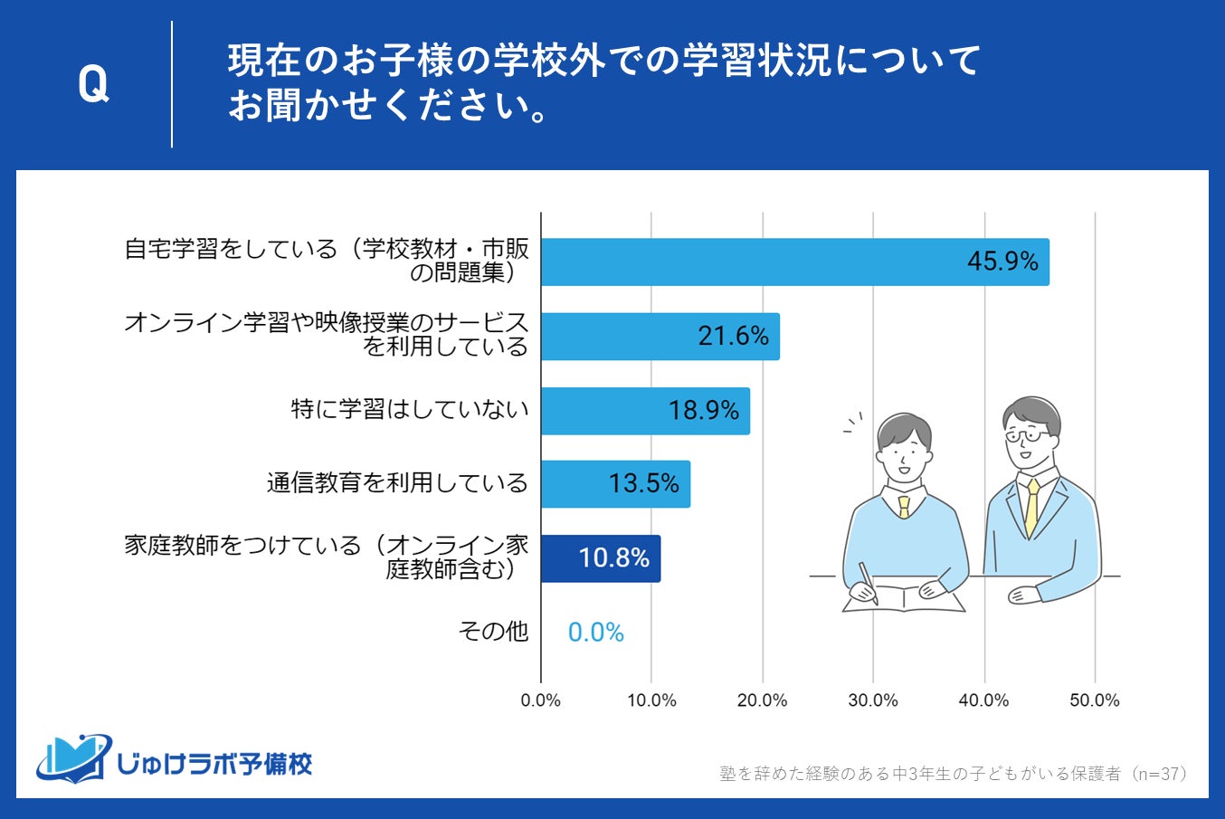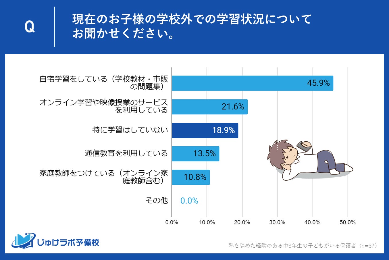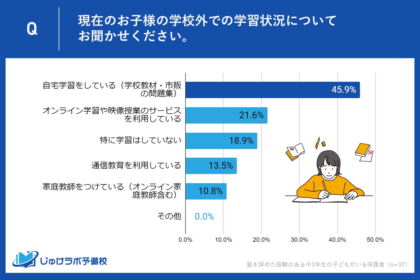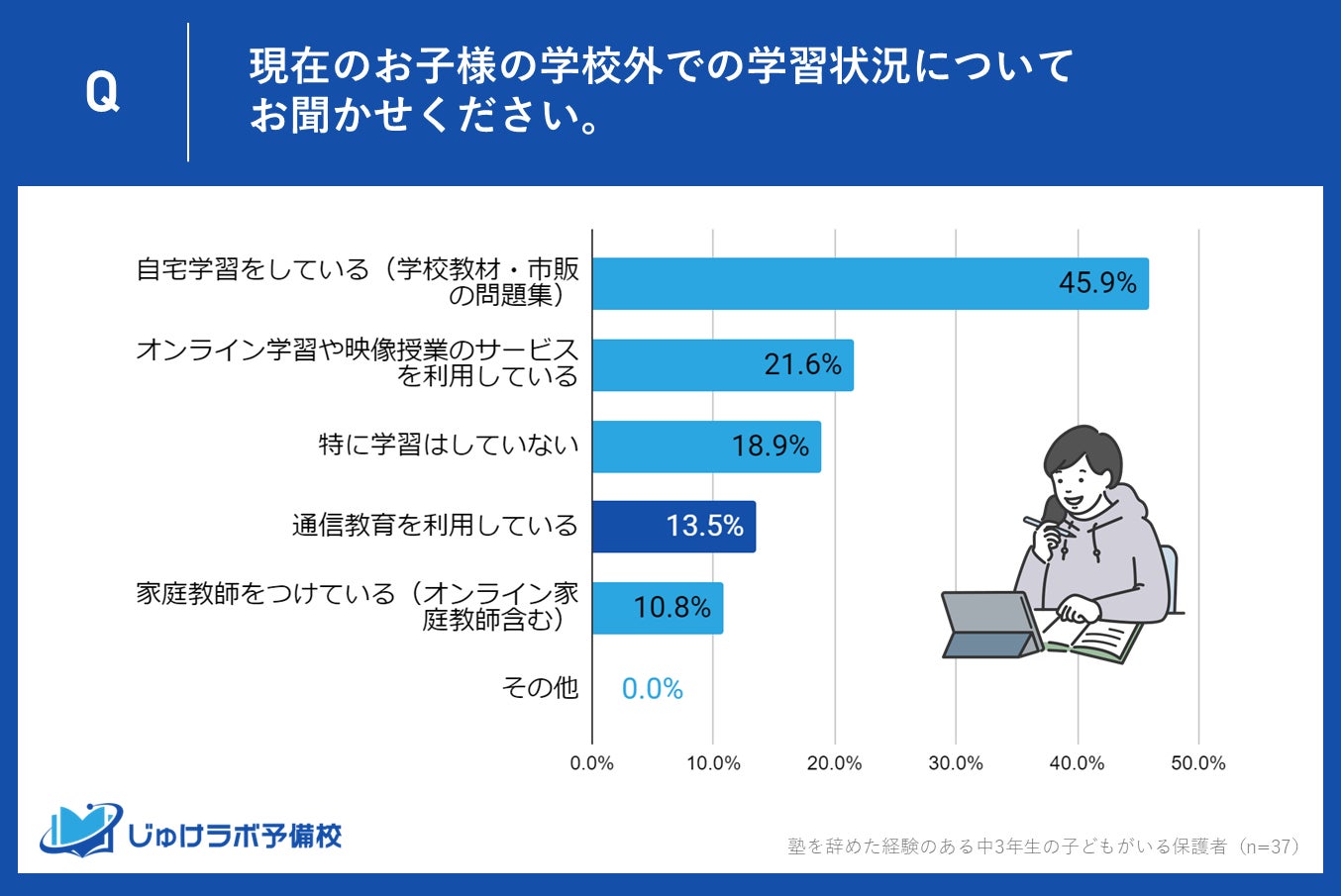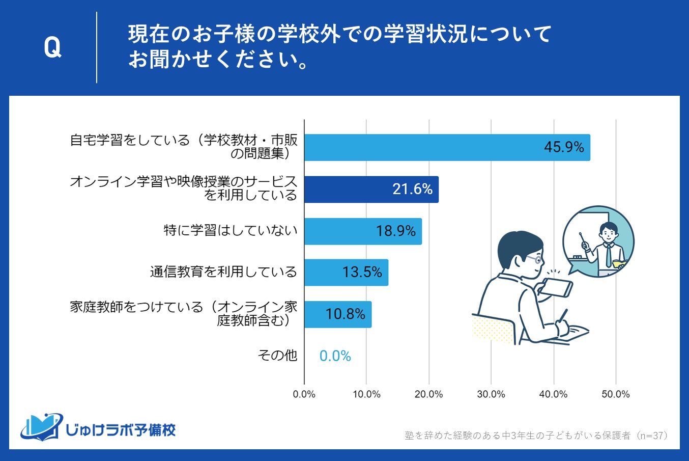 塾を辞めた後の学習方法としては、自宅学習が最多で45.9%の保護者が選択しており、オンライン学習(21.6%)、通信教育(13.5%)も支持されています。しかし、18.9%の保護者は特に学習をしていないと回答しました。
