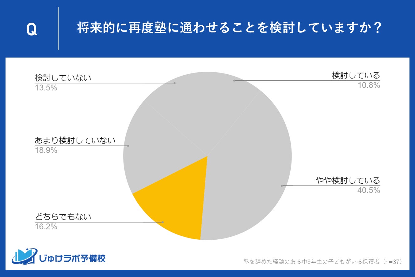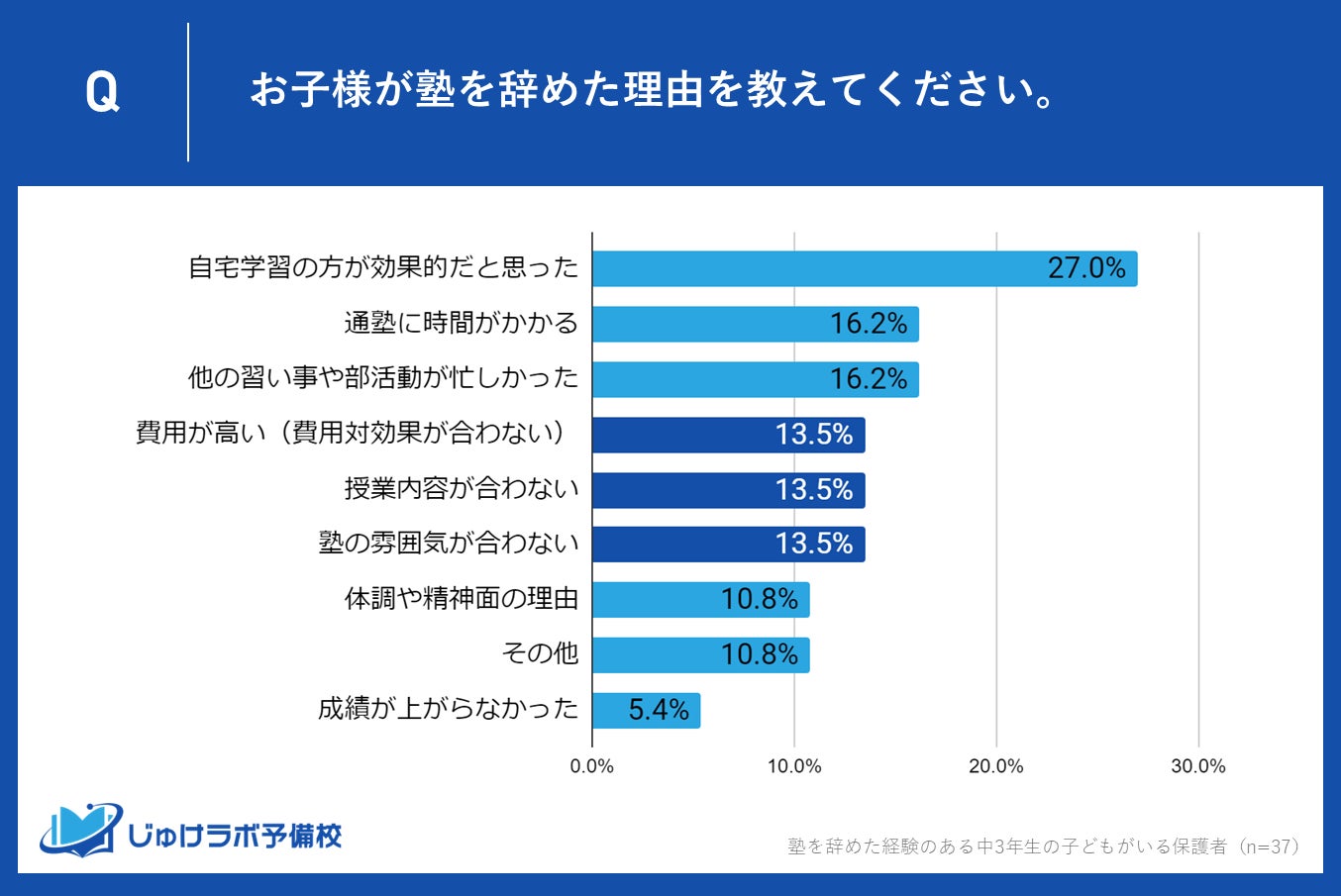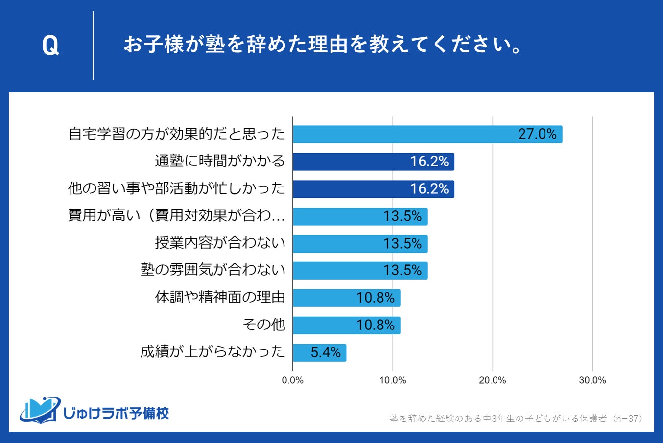 じゅけラボ予備校(所在地:大阪市北区、代表取締役:後藤智則)は、塾に過去通っていて現在は塾を利用していない中学生3年生の保護者37名を対象に、塾を辞めた理由に関する意識調査を実施しました。