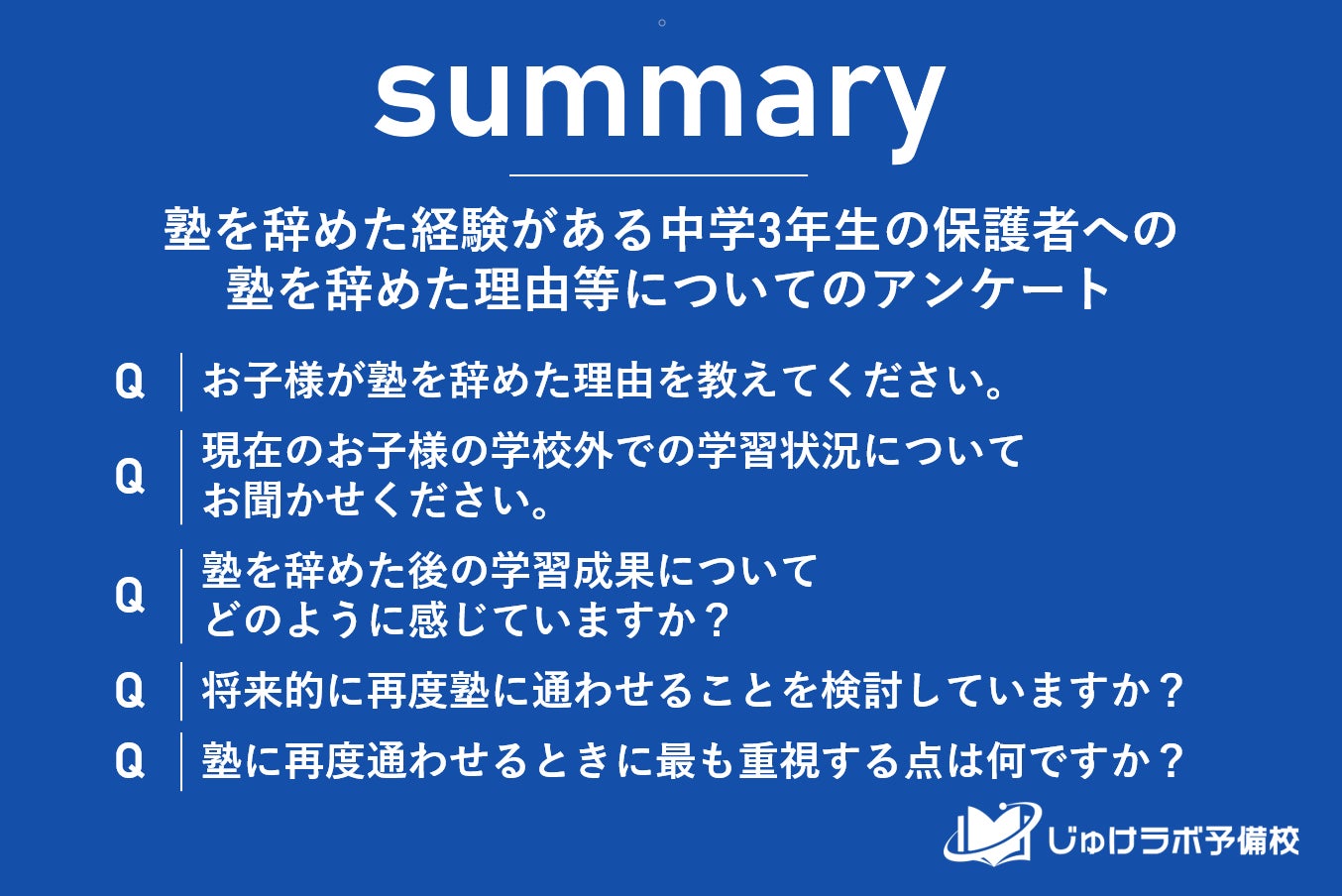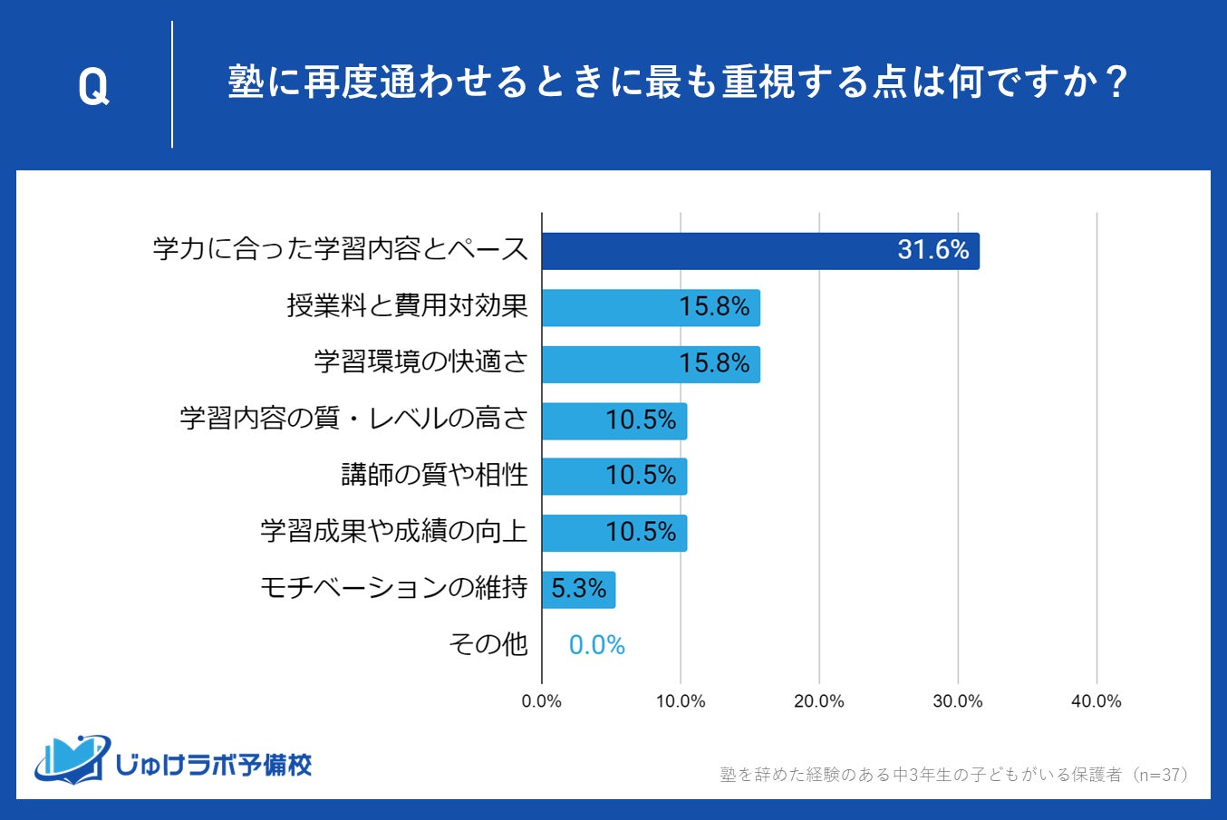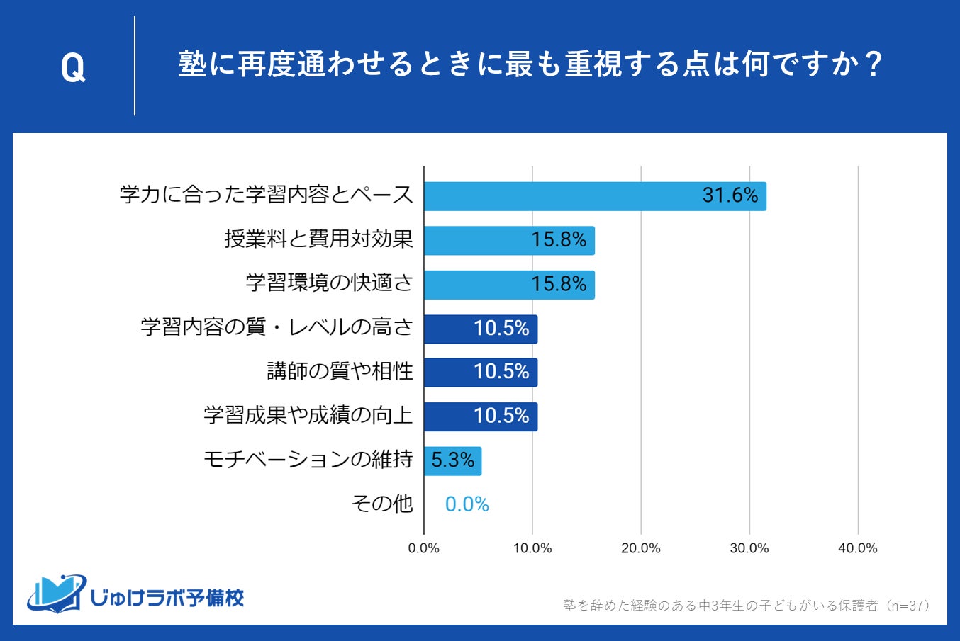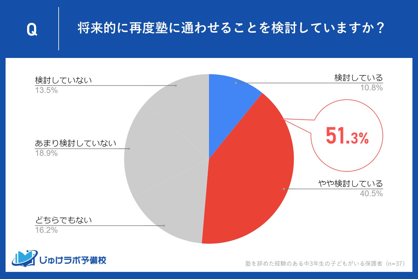 じゅけラボ予備校(所在地:大阪市北区、代表取締役:後藤智則)は、塾に過去通っていて現在は塾を利用していない中学生3年生の保護者37名を対象に、塾を辞めた理由に関する意識調査を実施しました。
