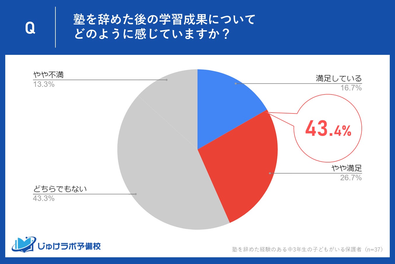 塾を辞めた後の学習成果に約43%が満足。不満を感じているのは約13%とわずか。
