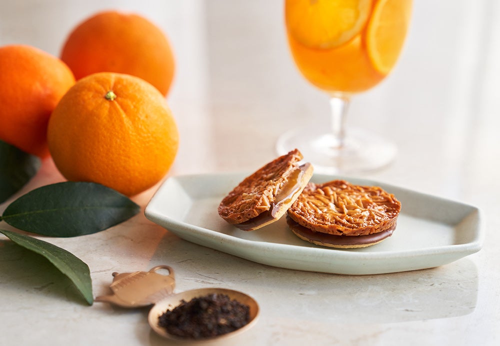 オレンジ果汁と華やかな香りのヌワラエリヤ産紅茶葉を合わせて炊き上げたとろけるキャラメルを、クーベルチュールチョコレートで包み込み、アーモンドフロランタンとバターサブレでサンドした新作「キャラマーサンド オレンジティー」。