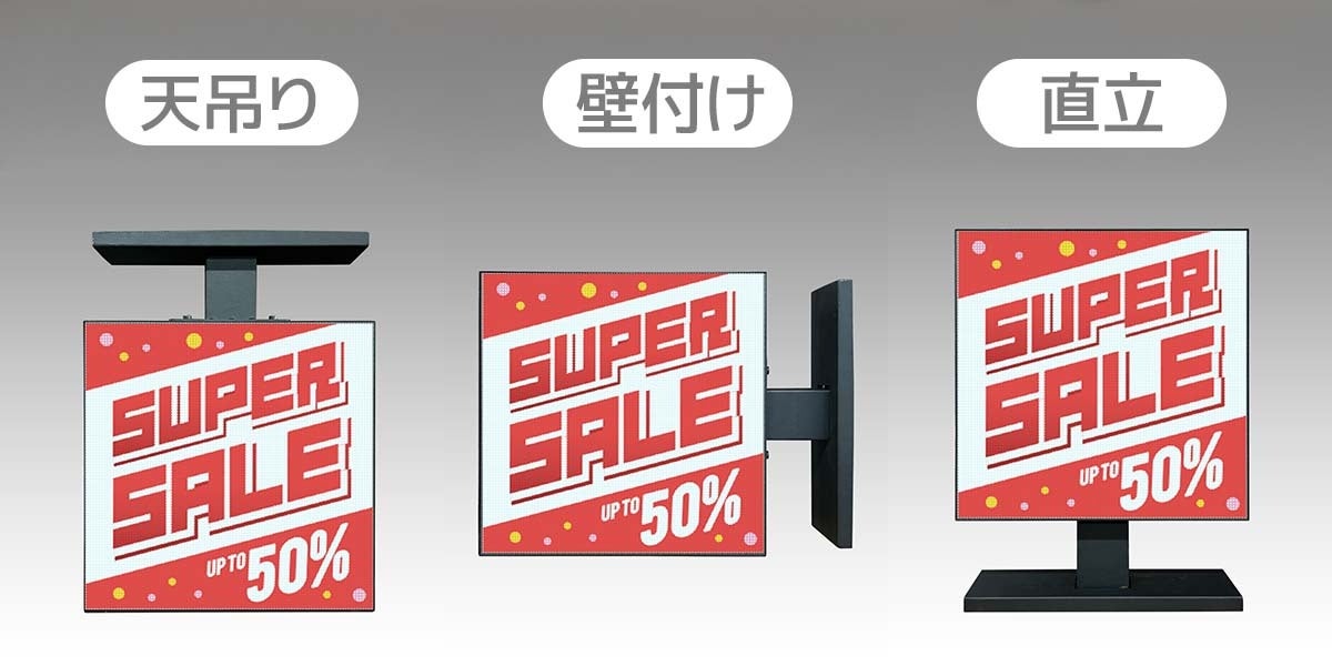 一台で前後両方向への訴求が可能なため、空間中央や通路沿いなど、人の流れが多い場所でも高い視認性を発揮します。