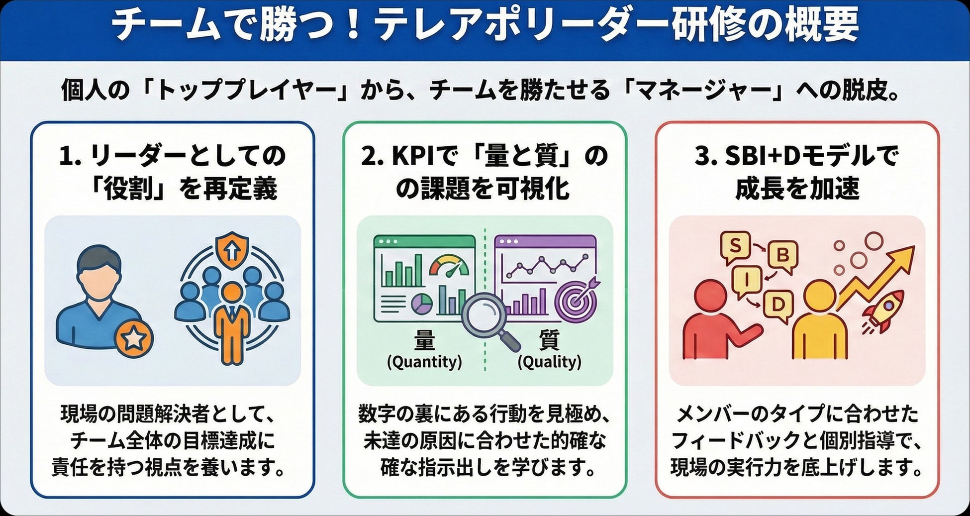 主要KPIを用いた進捗管理とSBI+Dモデルに基づくフィードバック手法を習得し、テレアポ現場の課題解決とメンバー育成を支援します。