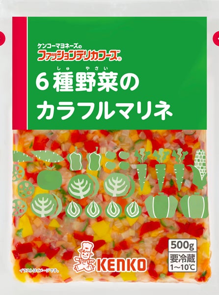彩りの良い6種類の野菜を5mm程度に角切りにし、白ワインビネガーとハーブの風味でほんのり味付けをしたマリネです。具材を揃える、カットする、調味するなどの手間をかけることなく、メニューを華やかに仕上げることができます。色合いだけでなく、具材の品目数も増やすことができるため、満足感にもつながります。
