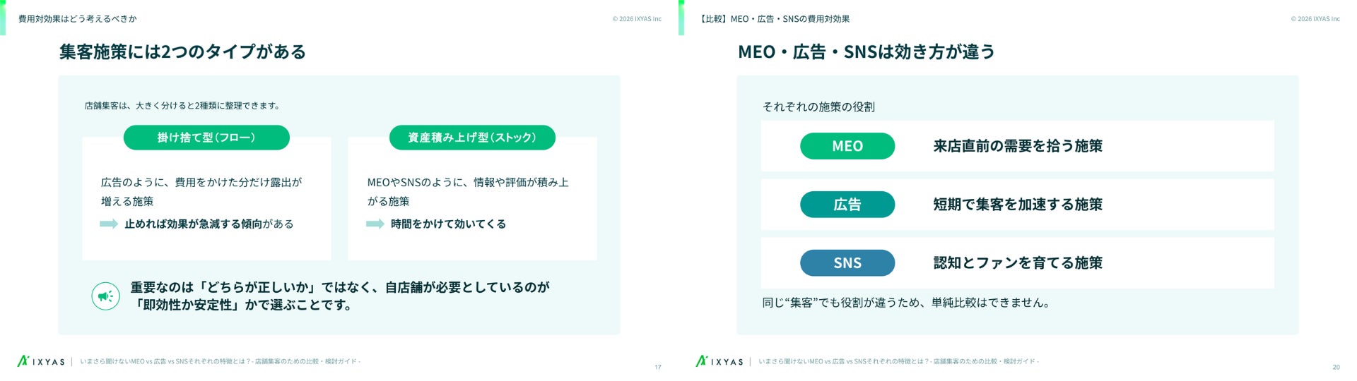 AI搭載型の店舗情報発信・分析プラットフォーム「STOREPAD(ストアパッド)」を提供するイクシアス株式会社(本社:東京都中央区、代表取締役社長 CEO:内藤 崇司)は、店舗集客における主要3手法(MEO・ネット広告・SNS)の特性を客観的に比較した解説資料「いまさら聞けないMEO vs 広告 vs SNS それぞれの特徴とは?ー 店舗集客のための比較・検討ガイド ー」を公開いたしました。