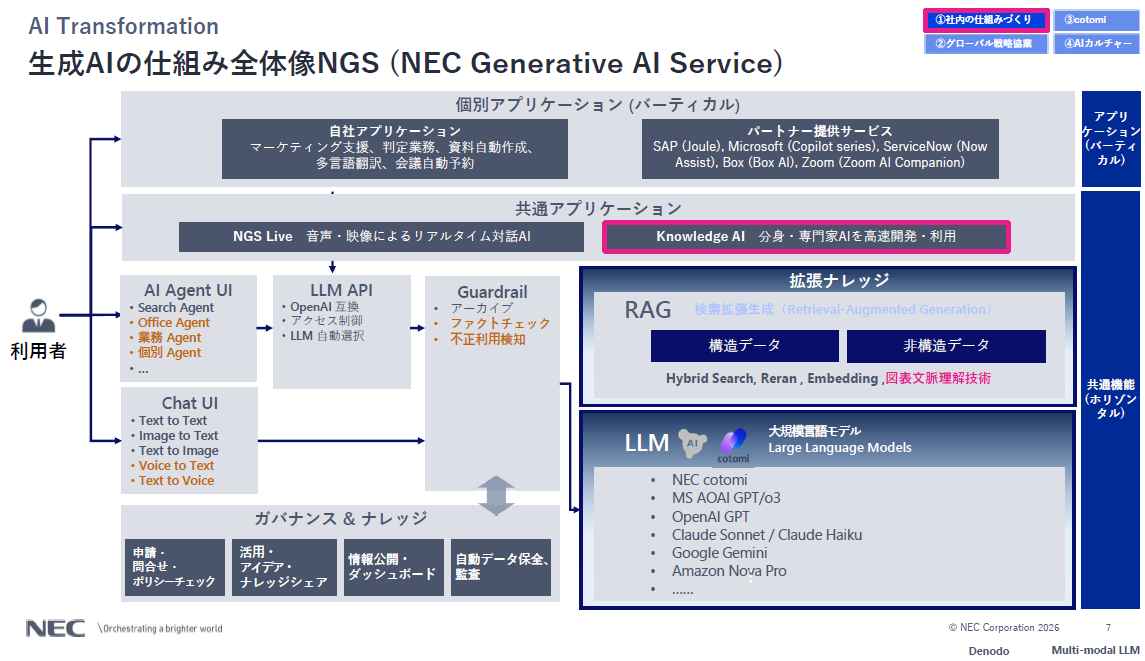 NECではAI活用を支える取り組みとして、最新LLMをセキュアに利用できる「NEC Generative AI Service(NGS)」を整備し、RAGの仕組みを通じて社内データを活用できる環境を構築。国内約8万人の従業員が利用可能な基盤として展開しています。さらに、個人の分身や専門知識を持つAIを容易に作成できる基盤「Knowledge AI」を導入し、2025年12月のリリース以降、すでに約1,800のクローンAIが作成されています。このAIを経営の意思決定の場である「経営コックピット」に組み込むことで、社長やCxOのAIが日々ダッシュボードを分析し、経営視点でのコメントやインサイトを自動生成する仕組みを実現しています。関氏は「見える化することで適正なプライシングが可能になり、22年度から24年度でNEC単体でのGP率が5.5%向上するなど、定量的な成果も創出している」と手応えを語りました。
