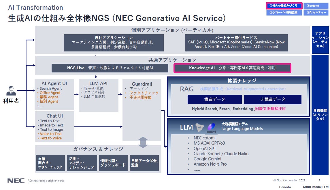 文書理解の強化: NECの「図表文脈理解技術」を用いて、文書内のグラフや画像を言語化し、AIの理解度を向上。