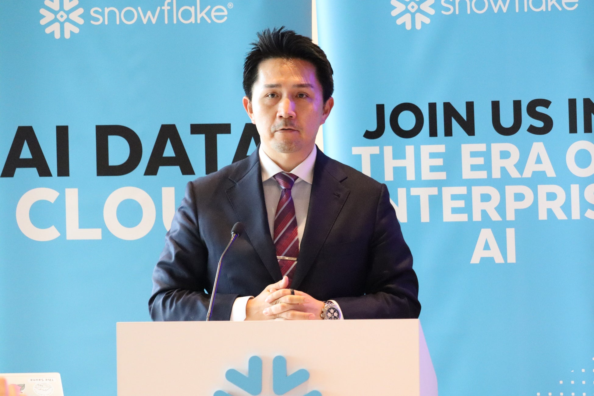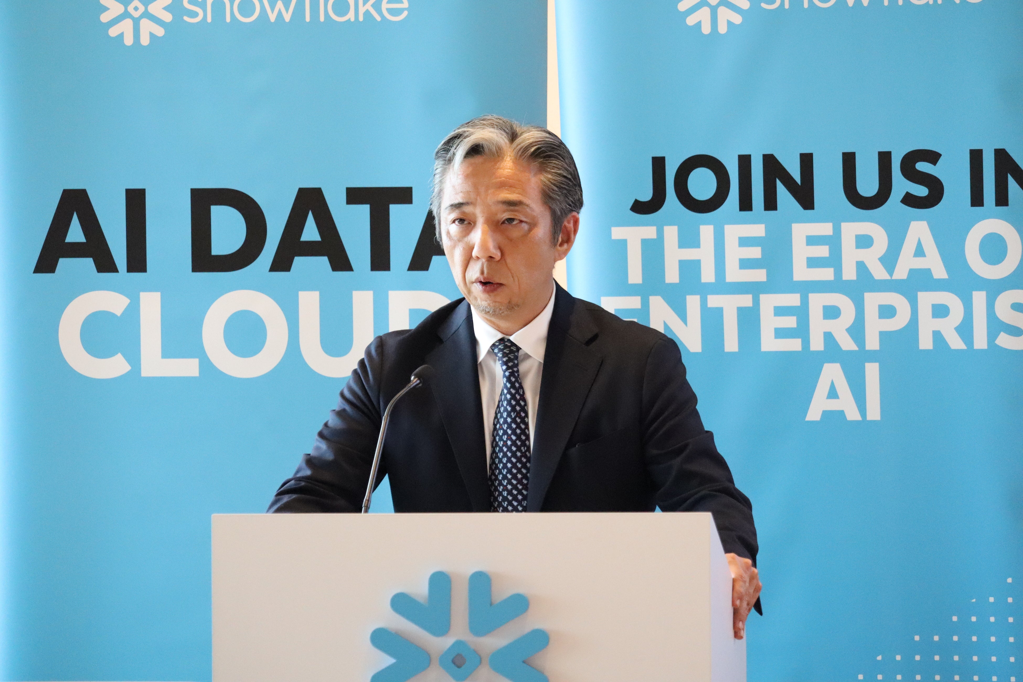 冒頭では、Snowflake 社長執行役員の浮田 竜路が登壇し、「『データ戦略なくして、AI戦略なし』。AI戦略の成功は堅牢なデータへの接続とエンジニアリングにかかっている」と強調。多くの日本企業が経営停滞の要因として直面している「3つの壁」として、「情報のサイロ化」「真実の不在」「意思決定の遅延」を挙げました。この解決策として、Snowflakeは信頼できる全社データを一元管理する「Single Source of Truth」の確立を提唱。これにより、経営者自らが課題を特定し、即断即決する『AI時代の能動的な経営』へのアップデートを後押しすると述べました。浮田は「データの力で、経営は確実に変わっていく。SnowflakeはAIが即座に機能する『AI Ready』な強固な基盤を提供する」と語りました。