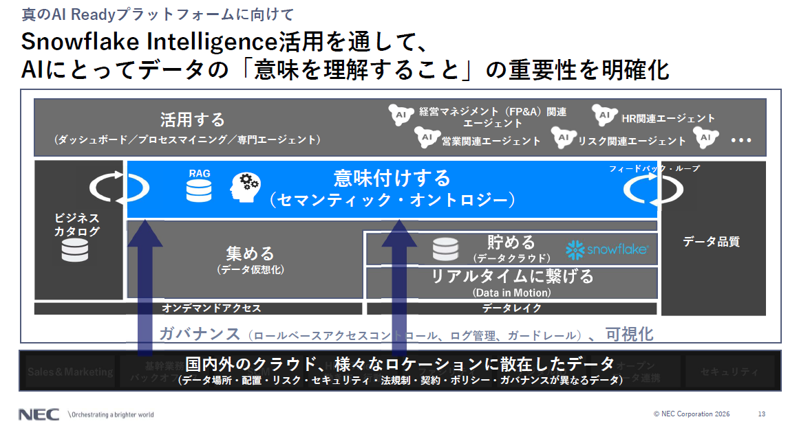 構造化データだけでなく、社内に約30PB存在する文書や音声などの「非構造化データ」を活用するため、同社はSnowflake Intelligenceを導入。これをNEC(NGS)の技術でさらに拡張し、以下の3点で強化を図っています。