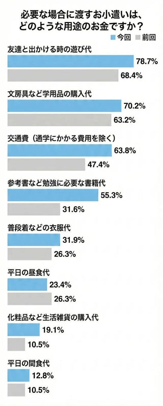 特に注目したいのが、「参考書など勉強に必要な書籍代」(55.3%)が、前回調査(31.6%)から大きく増えている点です。この結果からは、学習に関わる費用については「お小遣いとは切り分けて考える」家庭が増えていることが読み取れます。