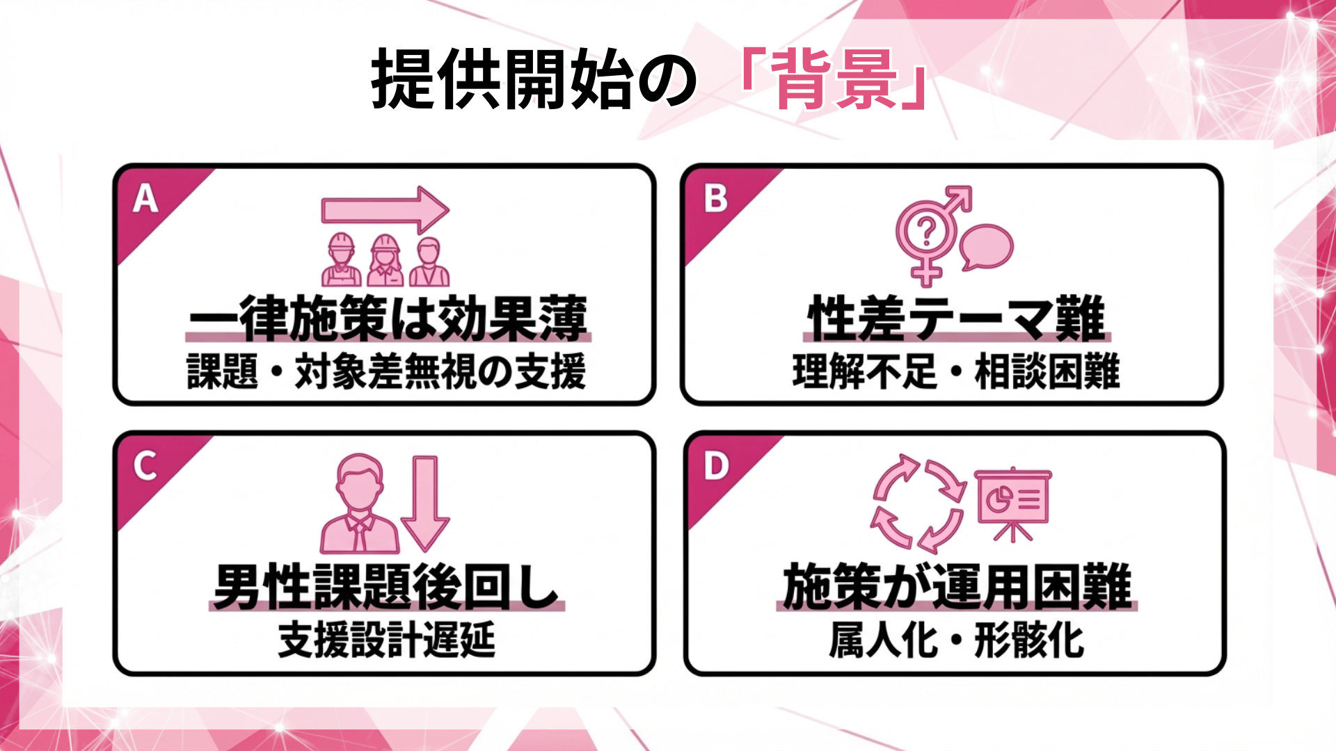 特に性差に関連する健康課題は、テーマの扱い方を誤ると、職場での理解不足、相談の出しづらさ、運用の属人化につながりやすい一方、適切に設計すれば、予防的な取り組みとして運用に組み込みやすい領域です。