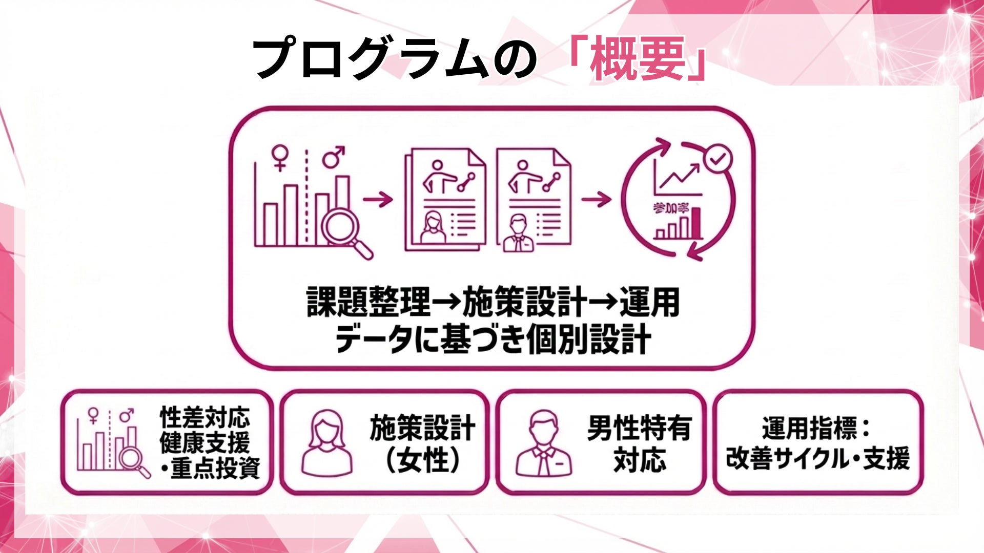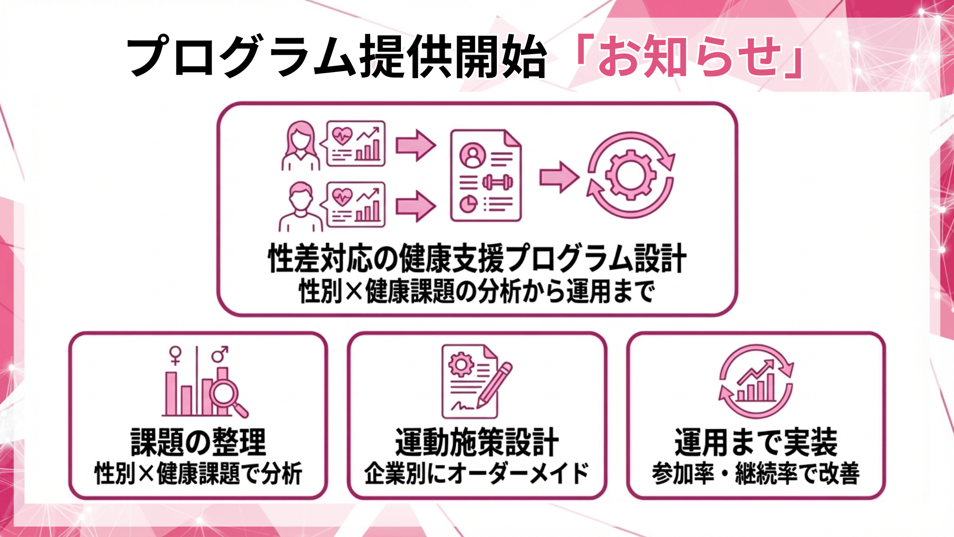本プログラムは、健診データやアンケート結果等を性別×健康課題で整理した情報を起点に、女性・男性いずれにも対応する健康支援を、運動施策として企業別に設計・実装するサービスです。