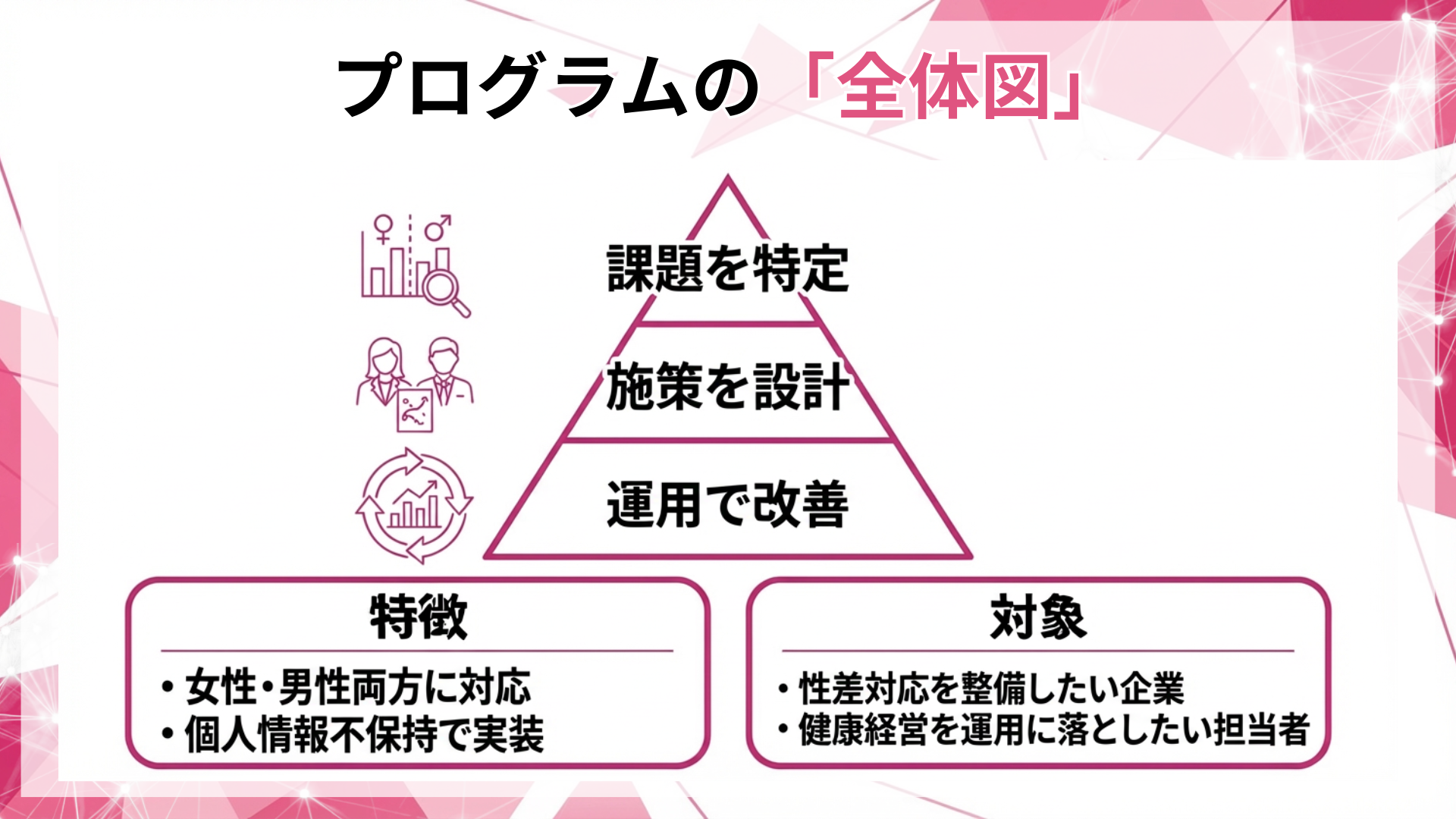 本プログラムは、企業が保有する情報を起点に、性差に応じた健康課題を整理し、運動施策として運用できる形に設計する支援です。