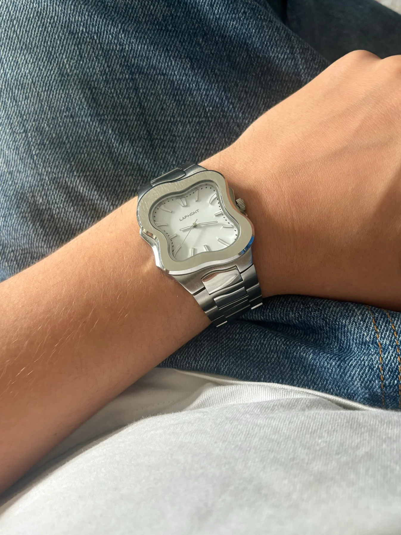 カスタムメイドのステンレススチール製ブレスレット(Dバックル仕様)、長さ調整ツール付属。ムーブメントには日本製(MIYOTA)を採用し、3ATM(日常生活防水)を備えています。ミニマルでありながら強い個性を放つ、まさに“感じる彫刻”としてのメタルウォッチです。