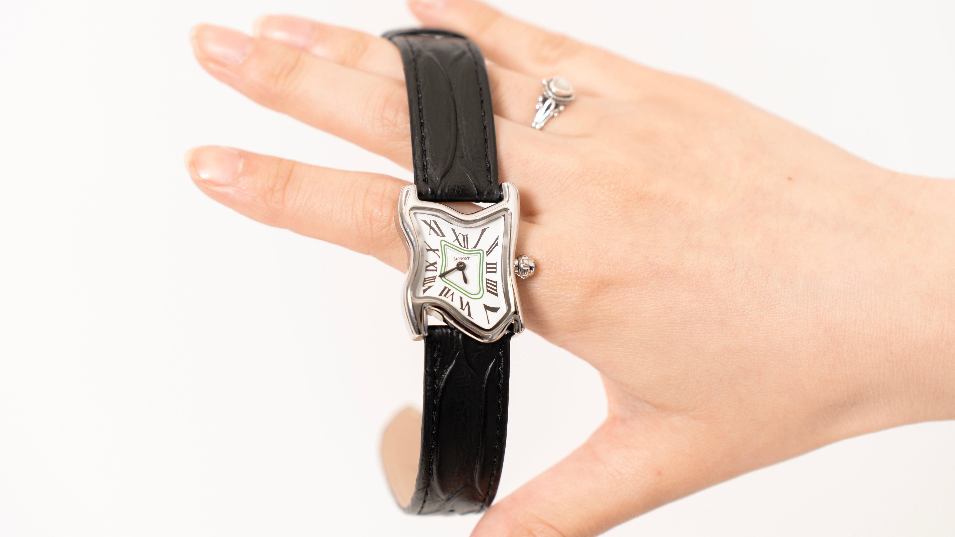 歪みを持つベゼルはブラッシング加工が施され、光の加減によって異なる表情を見せます。角度によって艶やかにも静謐にも変化するその質感は、アートピースとしての存在感を際立たせます。サイズは41mm × 50.2mmで圧倒的なの存在感を持ちながら、厚さはわずか7.4mm。視覚的インパクトと装着時の軽やかさを両立しました。