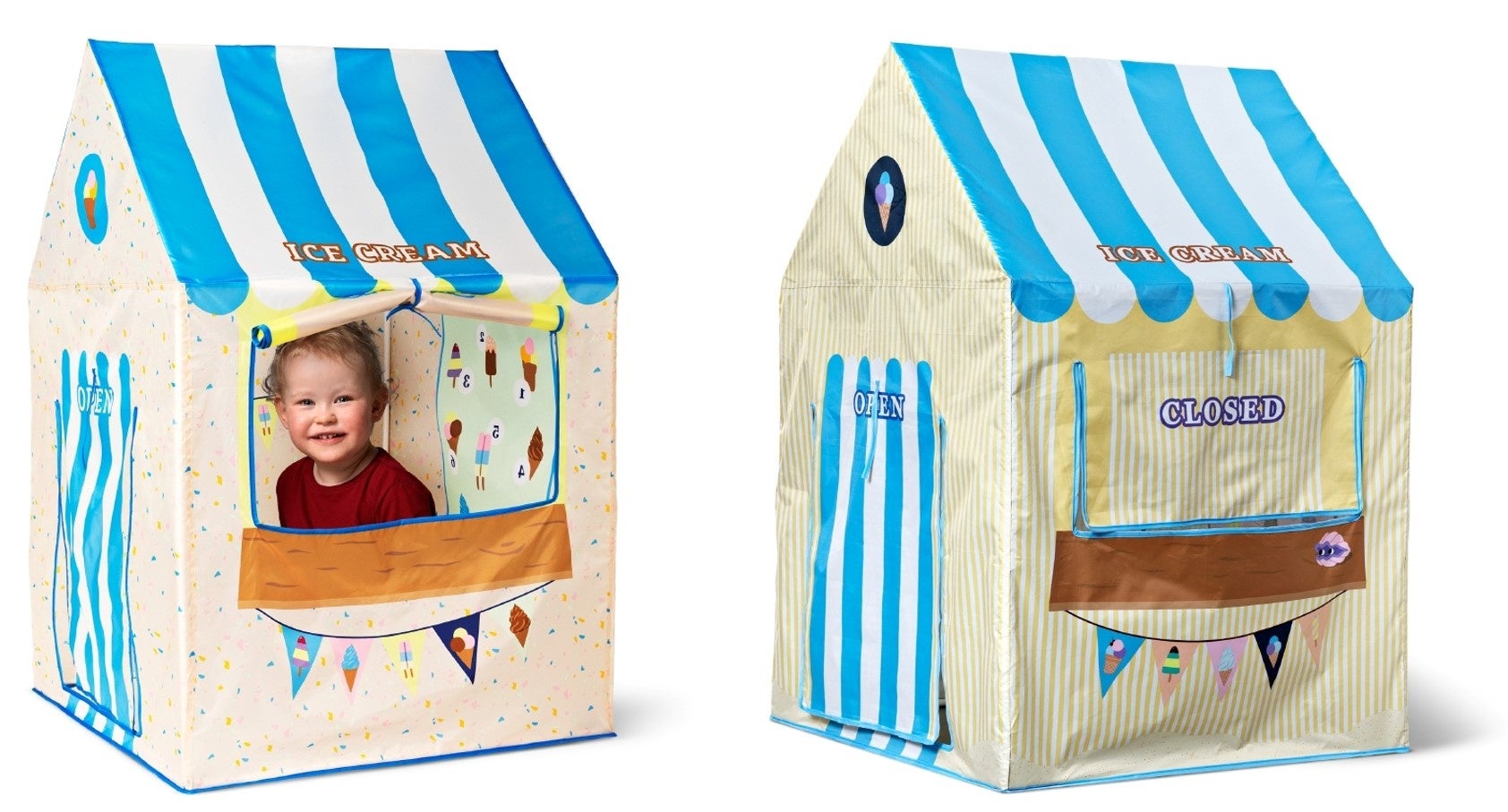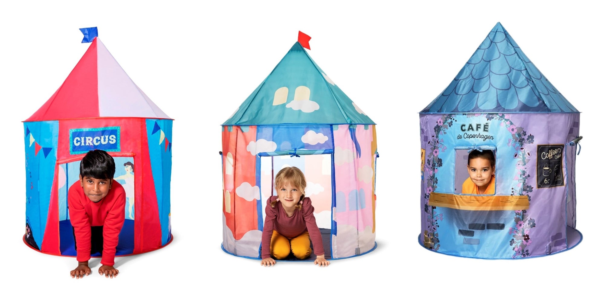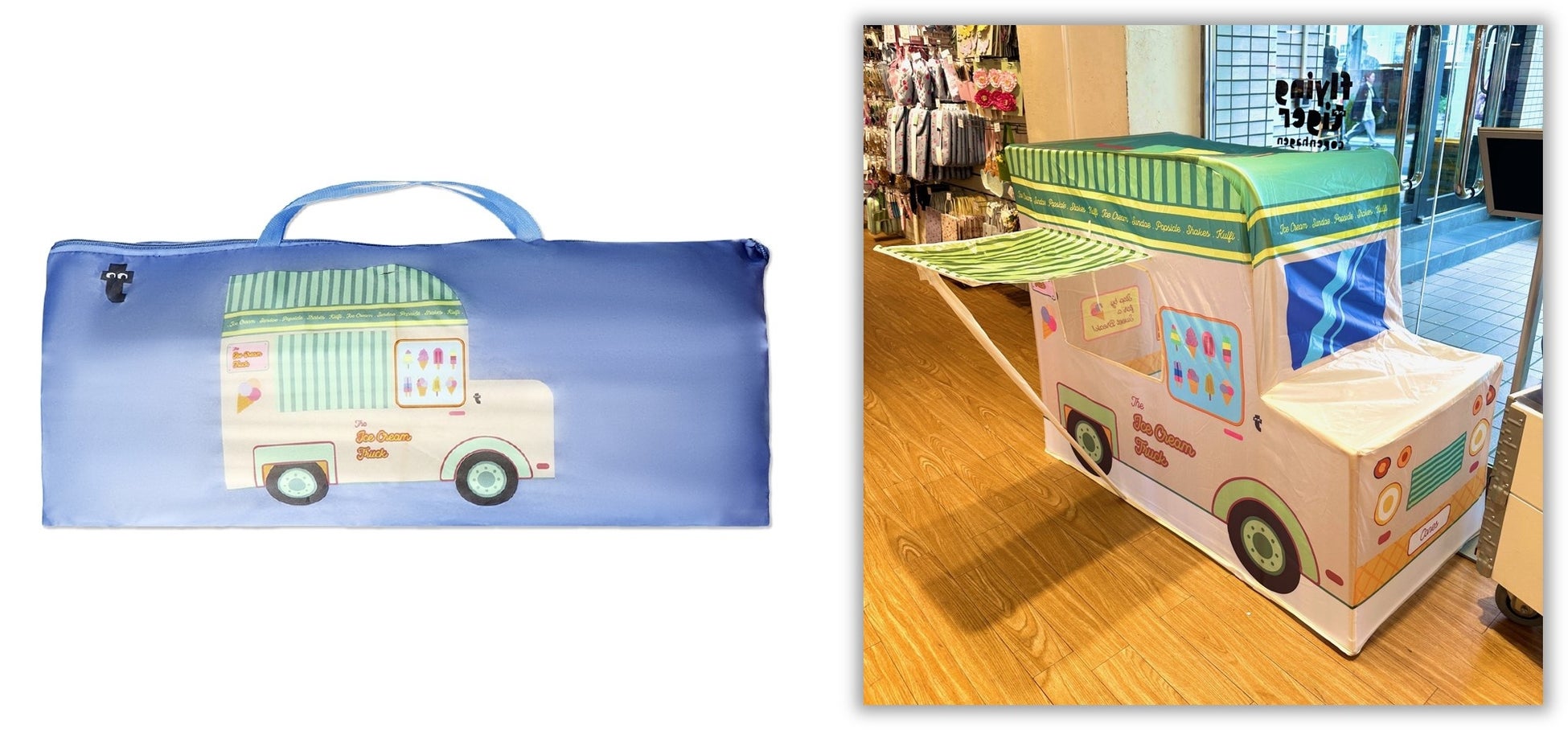 みなさんにウキウキお買い物を楽しんでいただきたい!という思いから、フライングタイガーの人気商品である「テント」と「ランチバッグ(ジッパーバッグ)」を期間限定・特別価格にてご提供します。お子様用の「テント」は、いろんな”ごっこ遊び”ができるラインナップ。アイスクリーム屋さん、お城の王様、サーカス団などがあります。