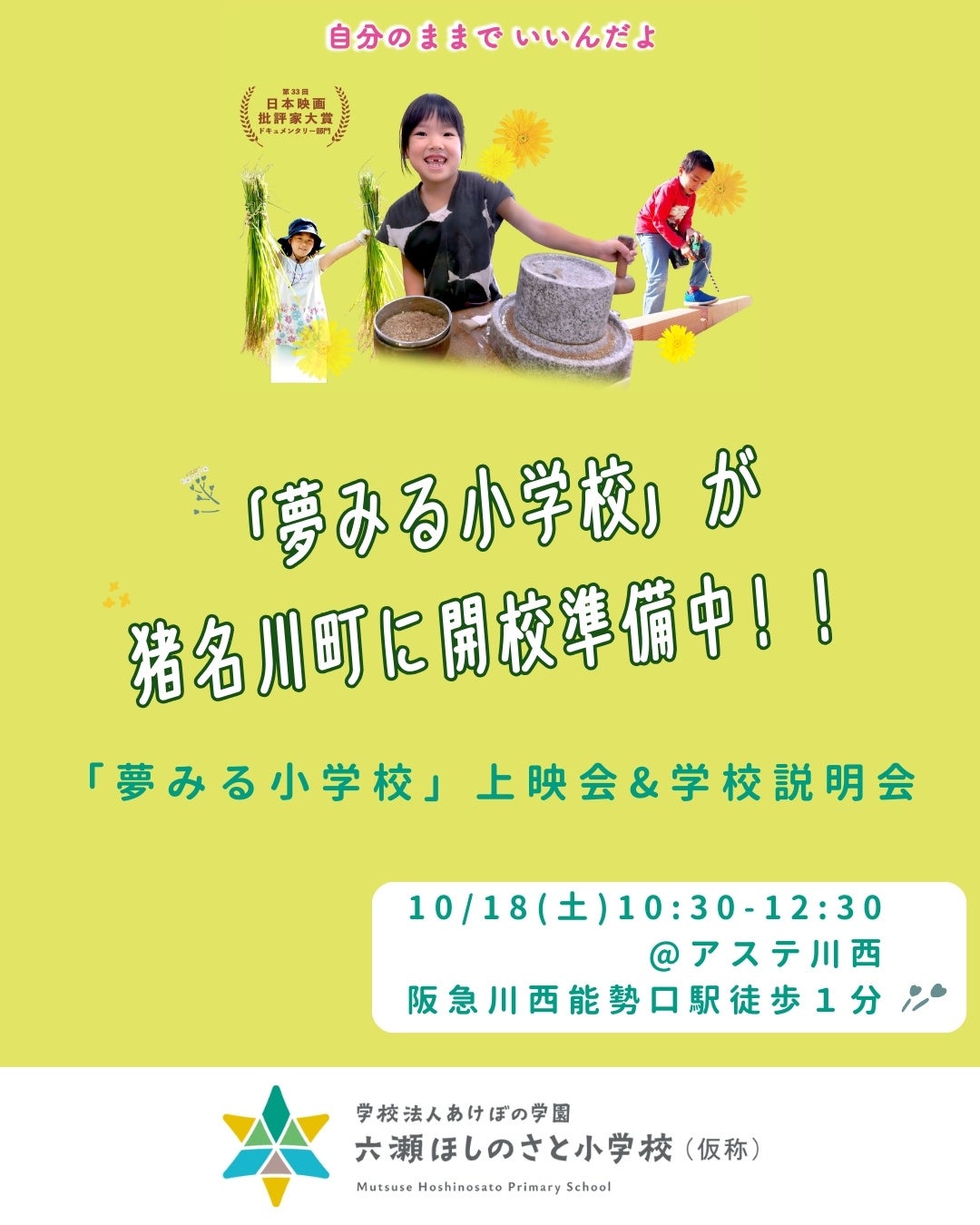 今回のイベントでは、映画「夢みる小学校」の上映会に加え、来年度開校に向けた「六瀬ほしのさと小学校(仮称)」の説明会も行います。
