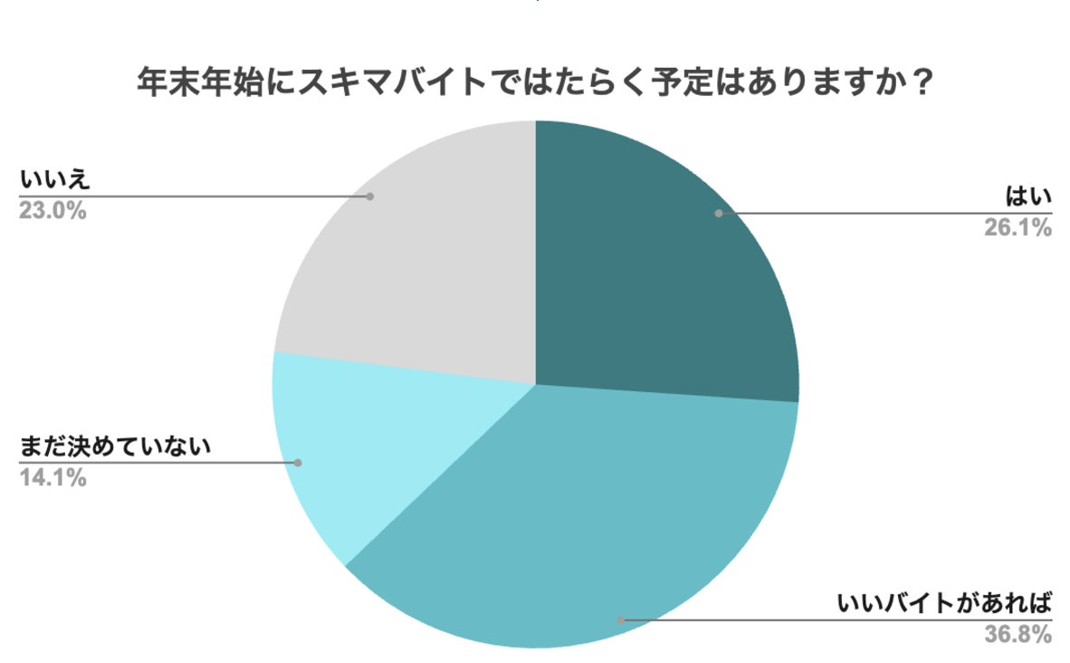 回答者のうち「はい(年末年始にスキマバイトをする予定がある)」と答えた26.1%に加え、「いいバイトがあれば」と答えた36.8%および「まだ決めていない」と答えた14.1%を合わせると、全体の77.0%が潜在的または明確なスキマバイトの意向を示しており、全体の6割近くが年末年始のはたらく意思を持っていることが分かる。