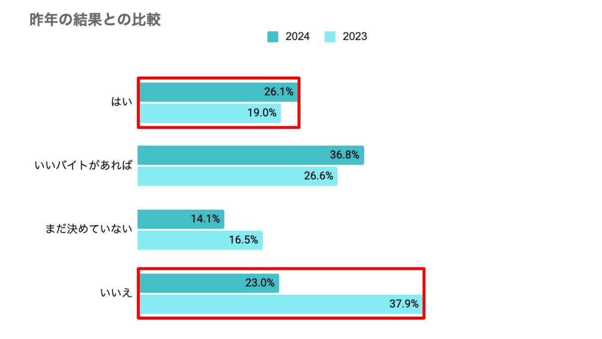 昨年同じ質問事項でおこなったアンケートの結果と比較すると、年末年始にスキマバイトをしないと答えた人は14.9%減少し、スキマバイトをする予定の人は7.1%増えた