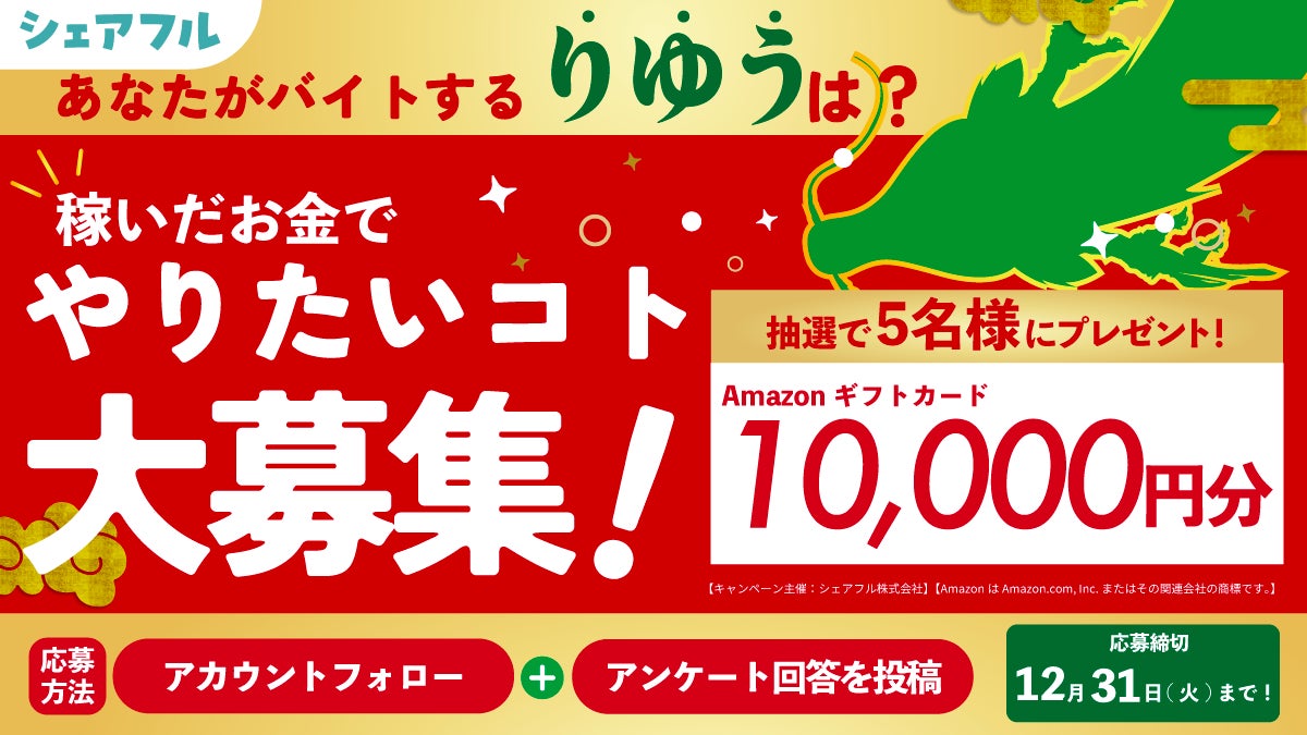 「アルバイト応援!シェアフル年末キャンペーン」キャンペーンは2024年12月26日(木)〜2024年12月31日(火)までの期間中に応募条件を満たした方の中から抽選で5名様に1万円分のAmazonギフトカードが当たるキャンペーンです。この機会にぜひご参加ください。