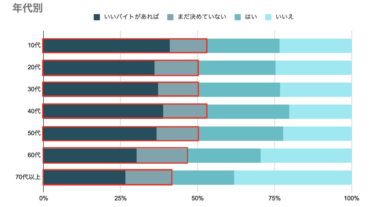 「いいバイトがあれば」「まだ決めていない」と回答した人の合計は、最も少ない70代以上でも41%、最も多い40代では53%にのぼり、年末年始のスキマバイトに対して全世代において一定の潜在層がいることがわかる