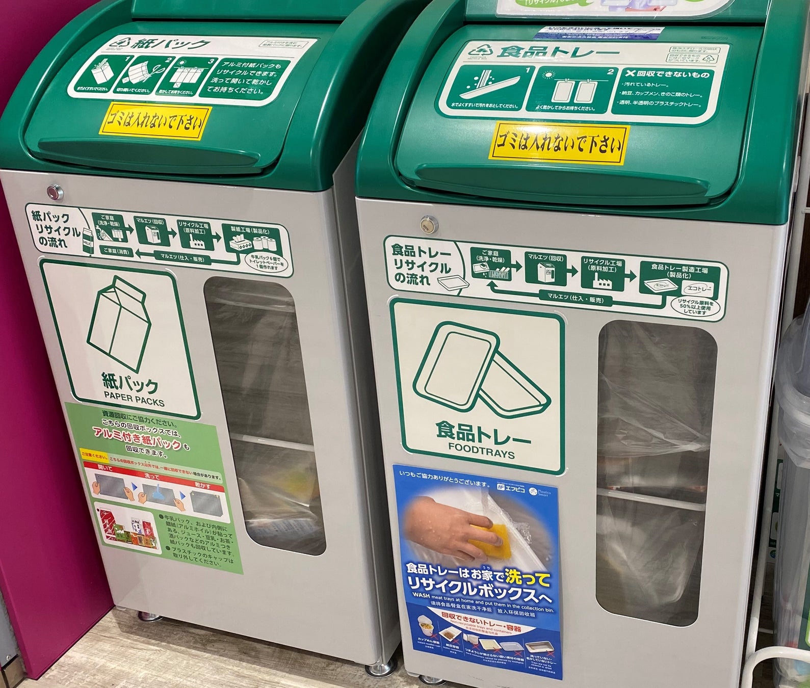 再生可能資源のリサイクルを促進するため、ほぼ全店の店頭にリサイクルボックスを設置し、食品トレイや紙パックなどを回収