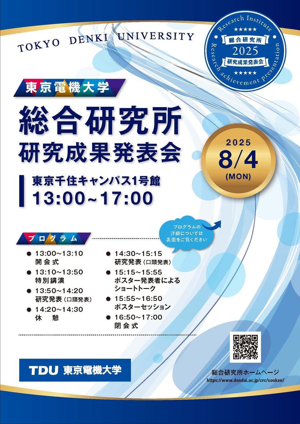 東京電機大学(学長 射場本忠彦)は、8月4日(月)13:00より東京千住キャンパス(東京都足立区)にて、本学総合研究所による2025年度の「研究成果発表会」を開催します。