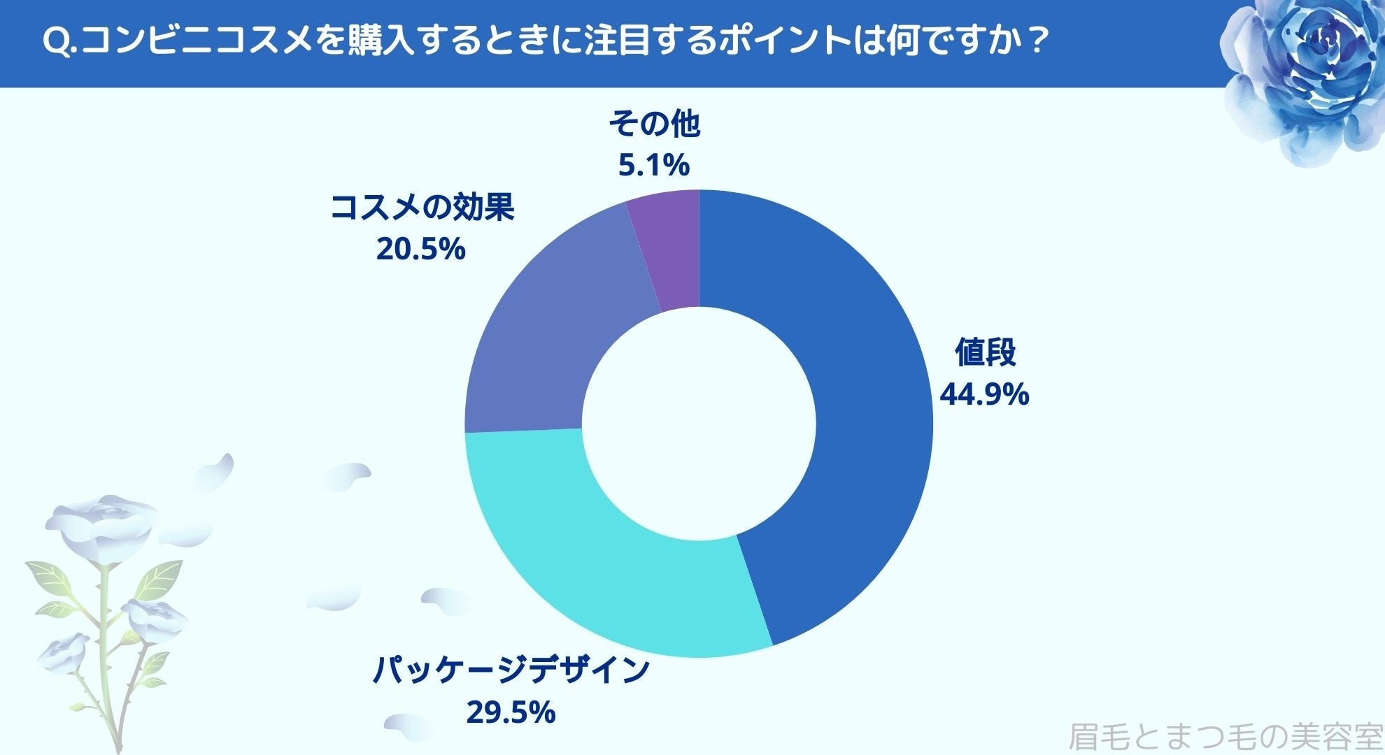 コンビニコスメを購入するときに注目するポイントは「値段(44.9%)」、「パッケージデザイン(29.5%)」、「コスメの効果(20.5%)」、「その他(5.1%)」という結果になりました。