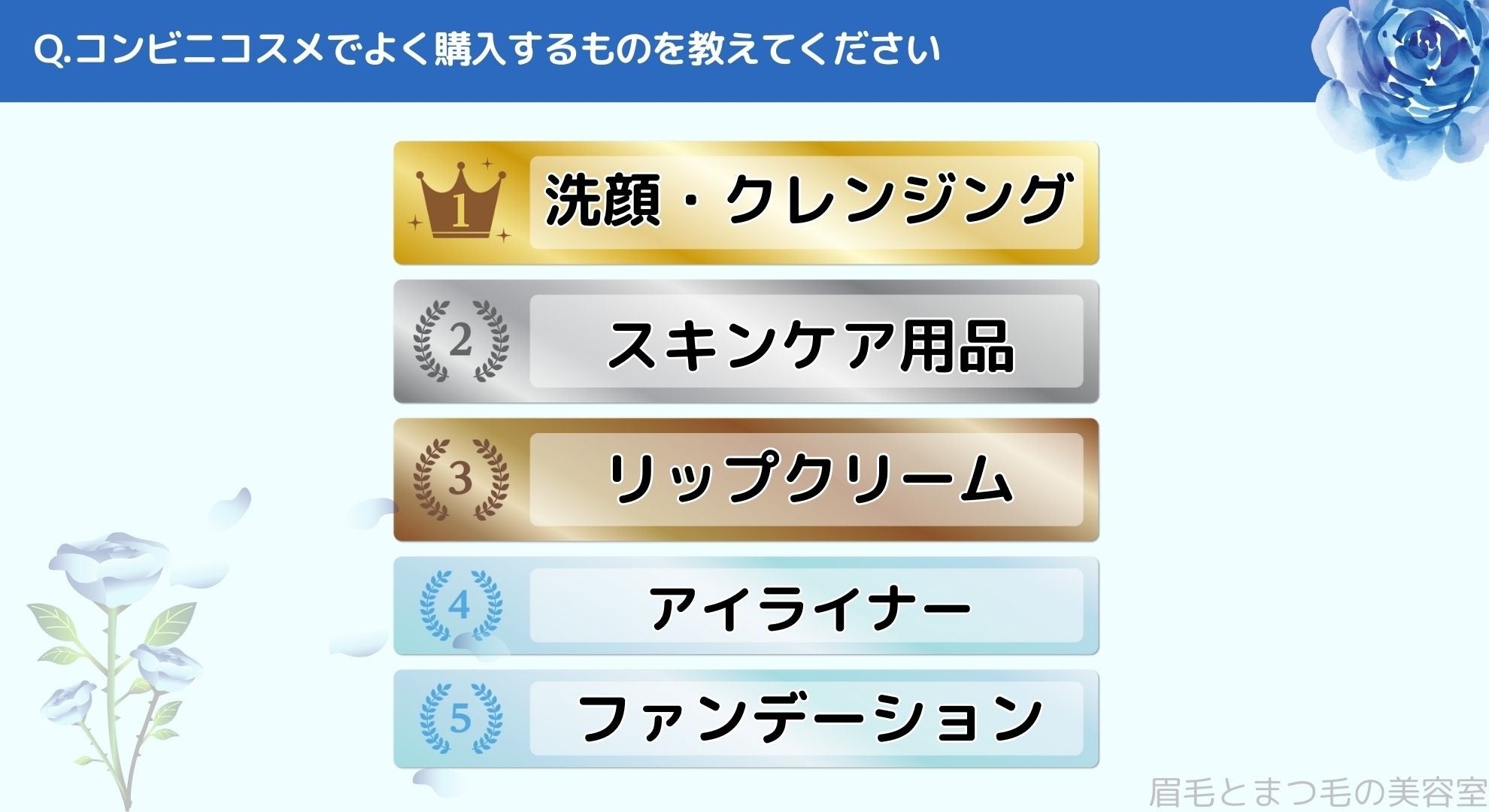 コンビニコスメでよく購入するものをお聞きしたところ「1位>洗顔・クレンジング」、「2位>スキンケア用品」、「3位>リップクリーム」、「4位>アイライナー」、「5位>ファンデーション」という結果になりました。