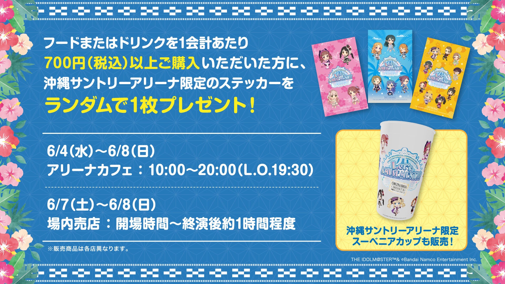 会場内にて、対象のフードまたはドリンクを1会計につき700円(税込)以上ご購入いただいたお客様には、沖縄サントリーアリーナ限定デザインの「THE IDOLM@STER CINDERELLA GIRLS STARLIGHT STAGE 10th ANNIVERSARY TOUR Let’s AMUSEMENT!!!」ステッカーを、ランダムで1枚プレゼントいたします。