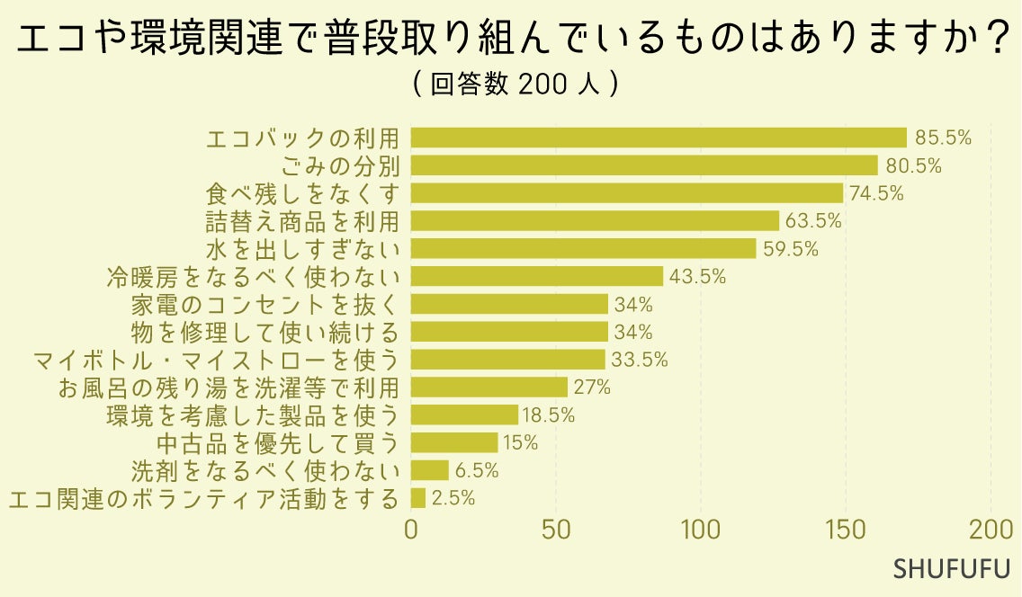 エコや環境関連で普段取り組んでいるものを尋ねたところ、1位は「エコバックの利用(85.5%)」、2位「ごみの分別(80.5%)」となりました。