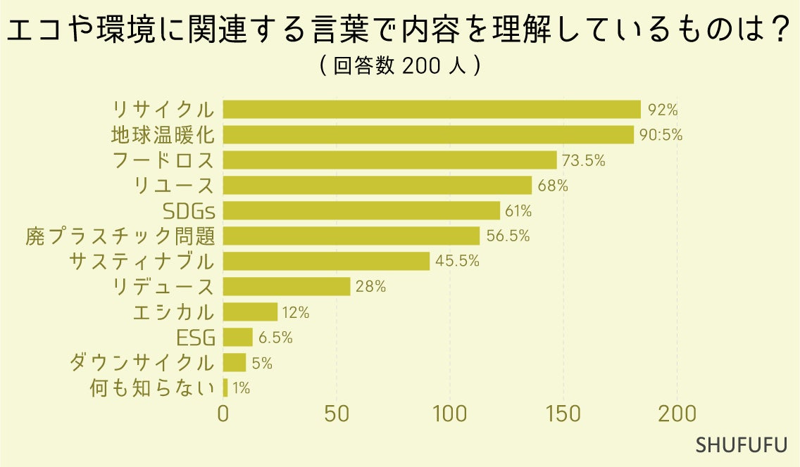エコや環境に関連する言葉で内容を理解しているものに関しては1位「リサイクル(92%)」、2位「地球温暖化(90.5%)」でした。リサイクルや地球温暖化という言葉は環境を意識せずとも日常的に聞く機会の多い言葉なので認知度が高いようです。