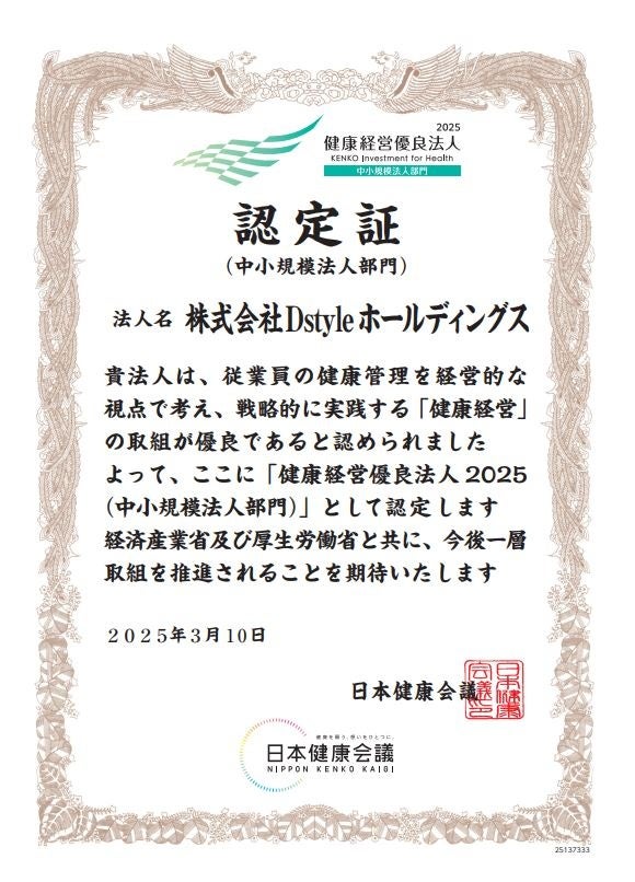 株式会社Dstyleホールディングス(東京都渋谷区、代表取締役会長 兼 社長 徳田充孝)は、このたび経済産業省と日本健康会議が共同で選出する「健康経営優良法人認定制度」において「健康経営優良法人2025(中小規模法人部門)」に認定されました。今回が初の認定となります。