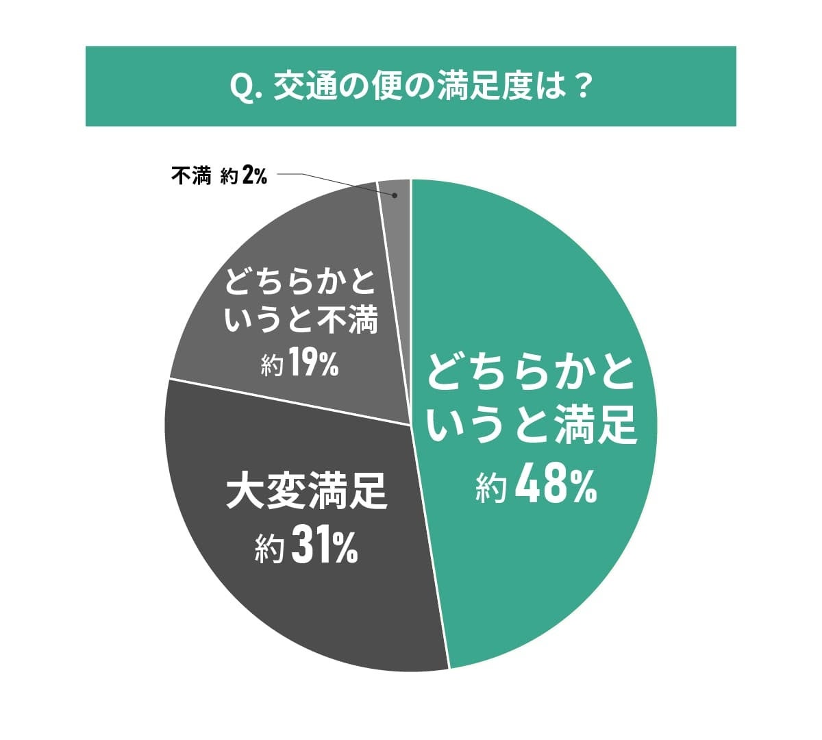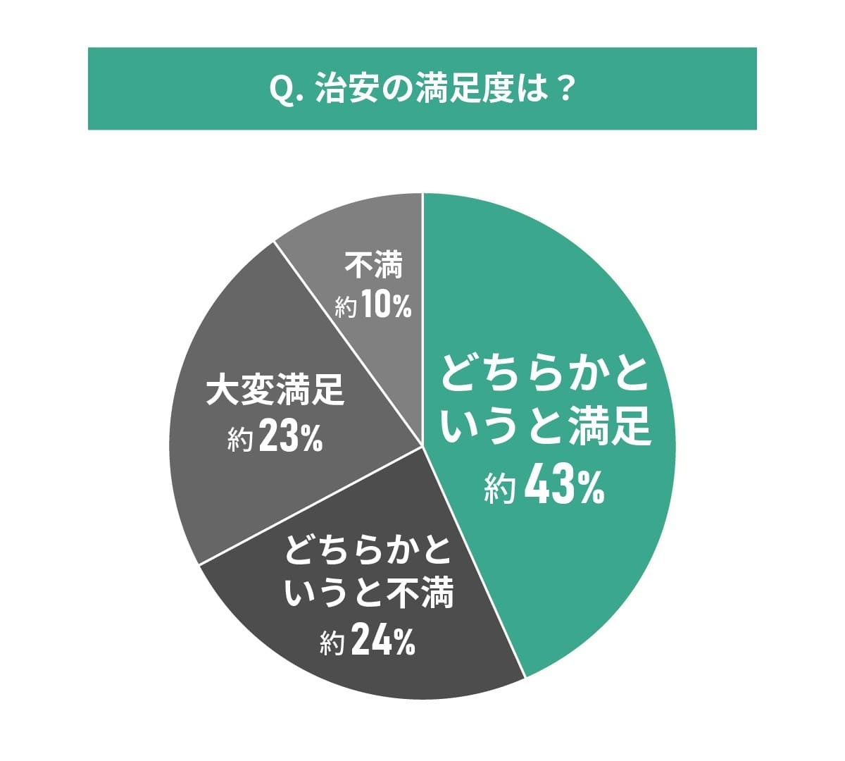 治安については約67%の住民が満足しており、安心して暮らせる環境であることが分かります。満足している住民からは「ファミリー層が多く落ち着いている」「大きな事件が少ない」「警察の巡回が頻繁で安心」「地域コミュニティが活発で見守り体制が整っている」といった声が聞かれます。