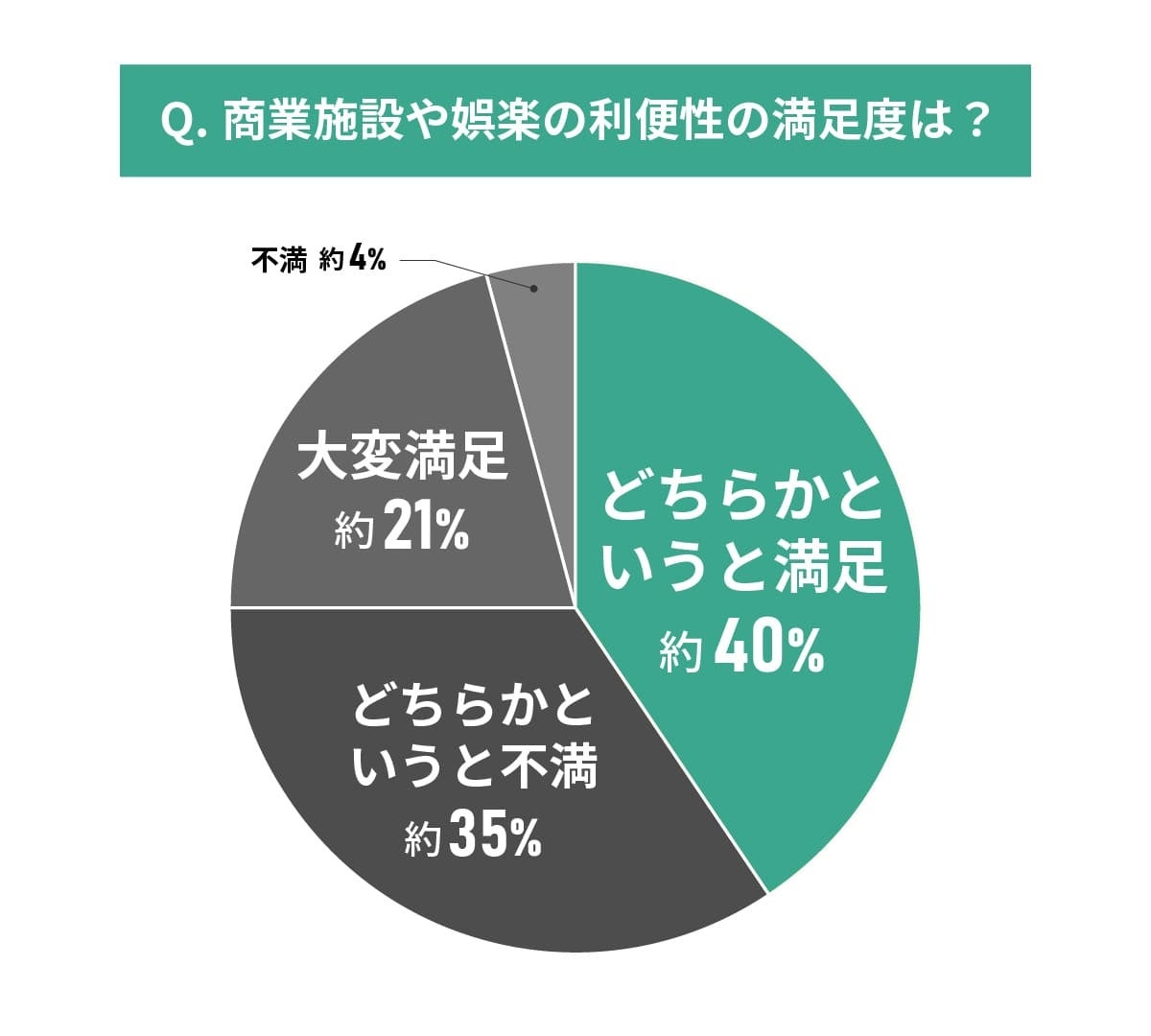 一方で不満の声としては「最寄り駅周辺に娯楽施設が少ない」「若者向けの施設が不足している」「カフェやおしゃれなお店が少ない」という意見が目立ちます。住む地域によって商業施設・娯楽へのアクセスに差があることが、満足度のばらつきにつながっているようです。