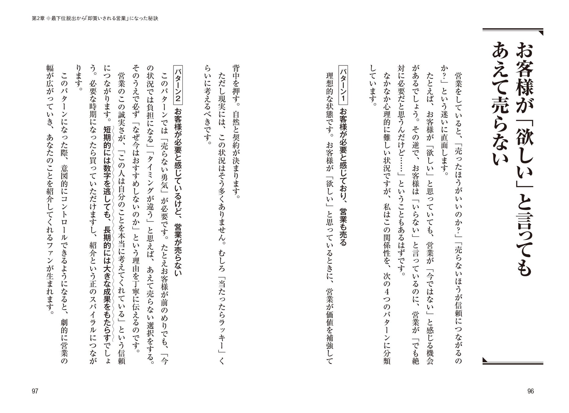 営業歴20年。入社10年目、商談不成立15連敗を喫し、全国約5,000人の営業の中で最下位に沈む。成果を出そうとするほど空回りし、売り込みや根性論に限界を感じていた。転機となったのは、上司の「こうなったら20連敗を目指してみよう」という一言。肩の力が抜け、「売るのをやめてみるか」と“楽転思考”で臨んだ初打席の商談で、いきなり連敗を脱出する。雑談、質問、沈黙、選択肢の提示など、商談を一つひとつ見直した結果、上昇気流に乗り、2年後には2万人を超える同社で上位0.1%が表彰される「社長賞」を受賞。