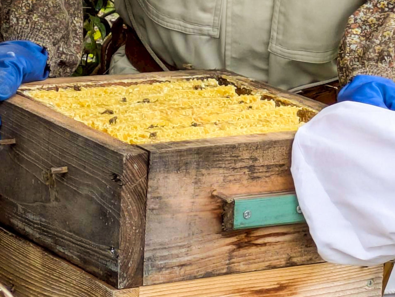 この日採蜜したのは、地域の里山に咲く多様な花々から集められたニホンミツバチの百花蜜。