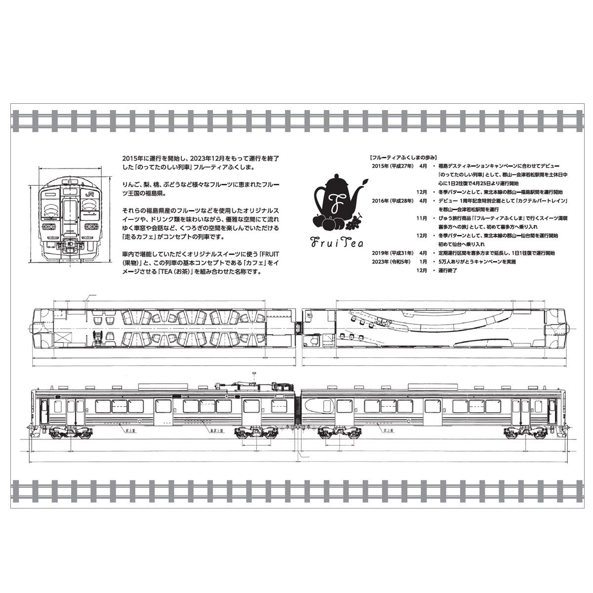 今回、初めて「フルーティアふくしま」の車両図面を活用したデザインを「駅スタンプ帳」に取り入れています。貴重な図面を通じて「フルーティアふくしま」の魅力をお楽しみいただけます。