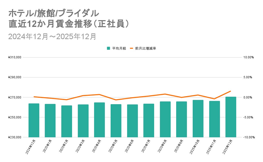 1位の「ホテル/旅館/ブライダル」と17位の「建設/土木/エネルギー」における直近の月給推移を比較すると、「ホテル/旅館/ブライダル」では2024年12月の263,921円から2025年2月には261,801円まで減少しましたが、その後は緩やかな上昇と下落を繰り返しながら推移。