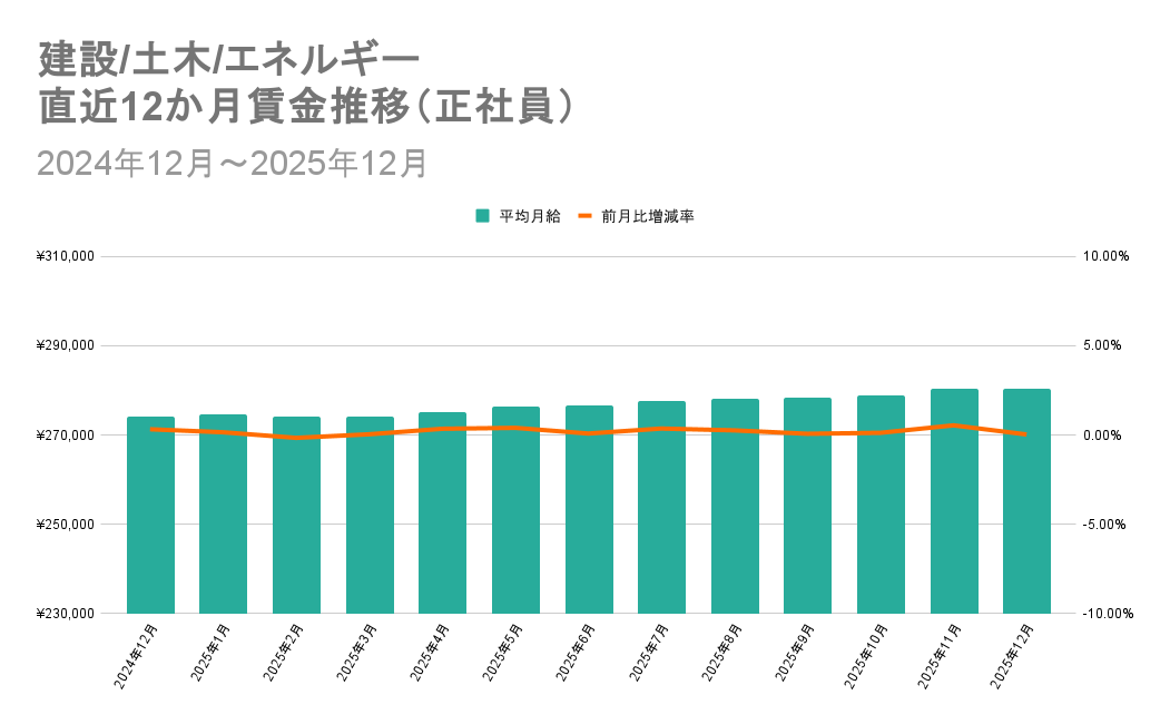 「建設/土木/エネルギー」の平均月給は増加幅こそ小さいものの、安定した上昇推移を示しています。
