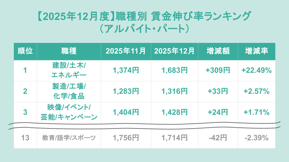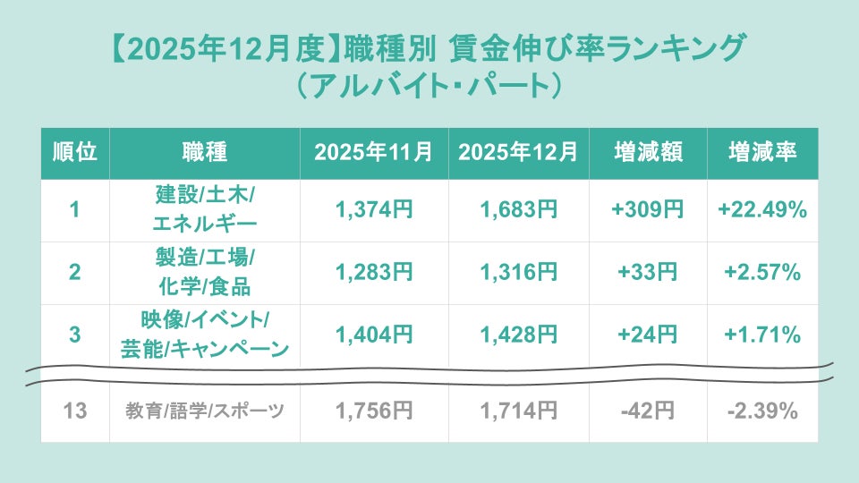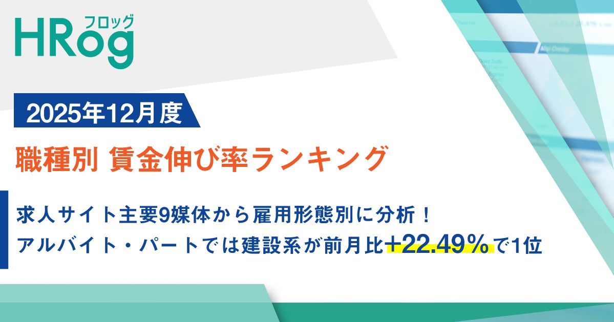 求人サイト主要9媒体から雇用形態別に分析!アルバイト・パートでは建設系が前月比+22.49%で1位【2025年12月度 職種別 賃金伸び率ランキング】