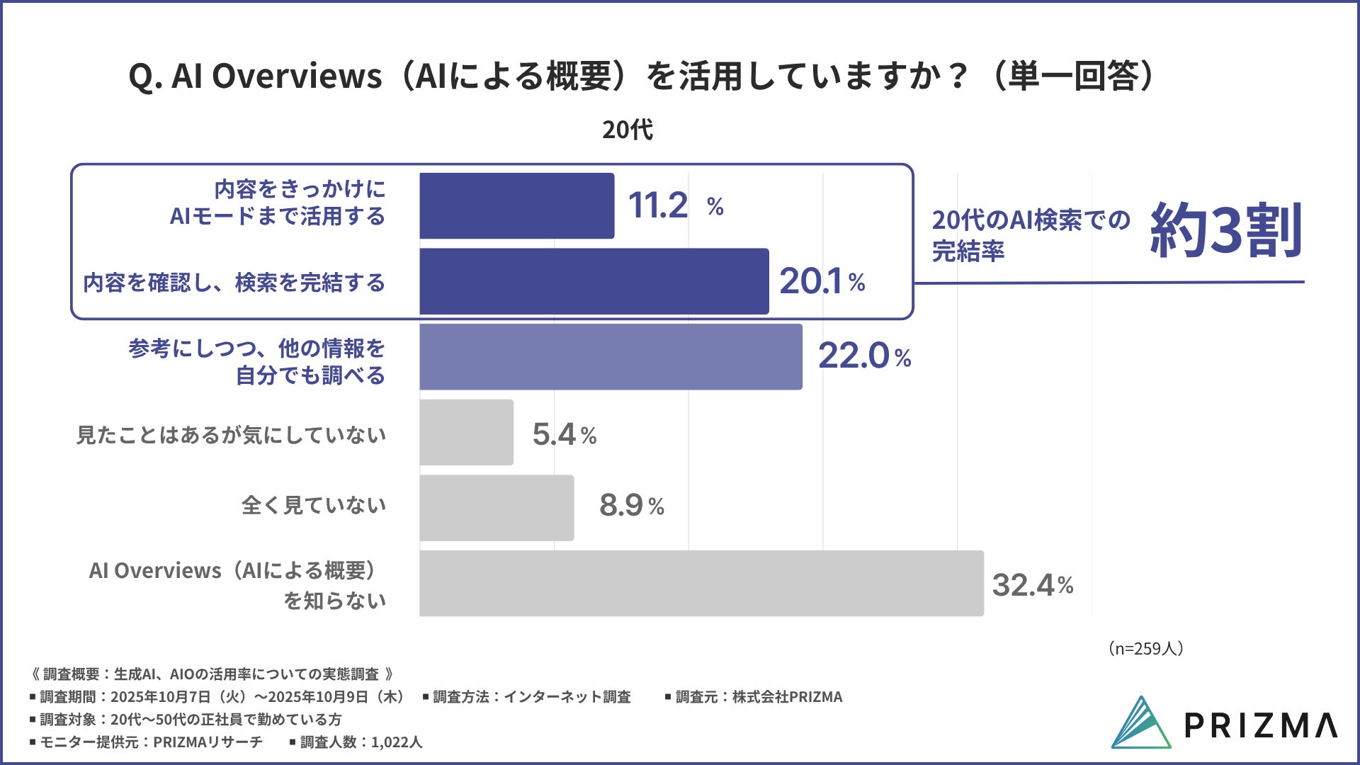 さらに、「AI Overviewsの活用」についても尋ねたところ、20代ではAI検索結果で情報収集を完結している方が3割以上という結果になりました。