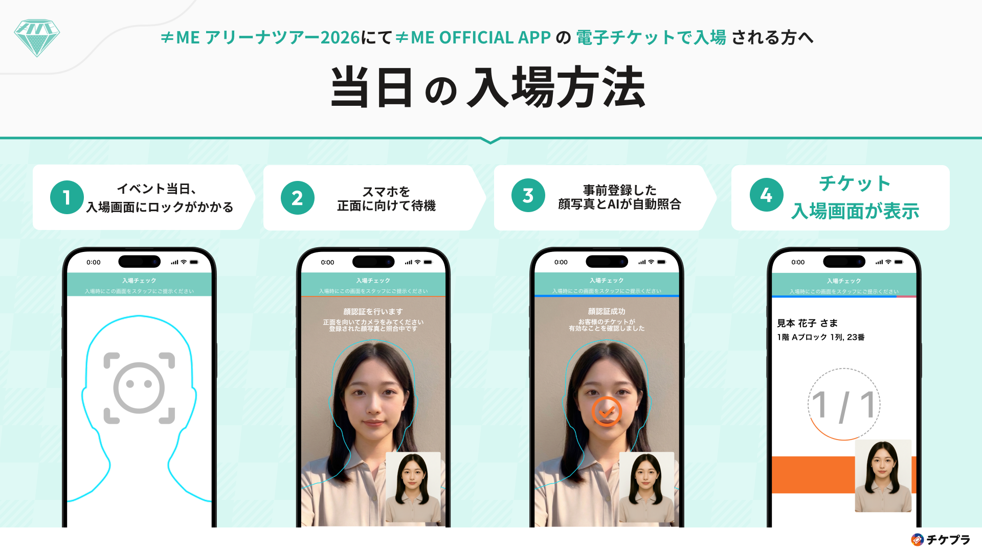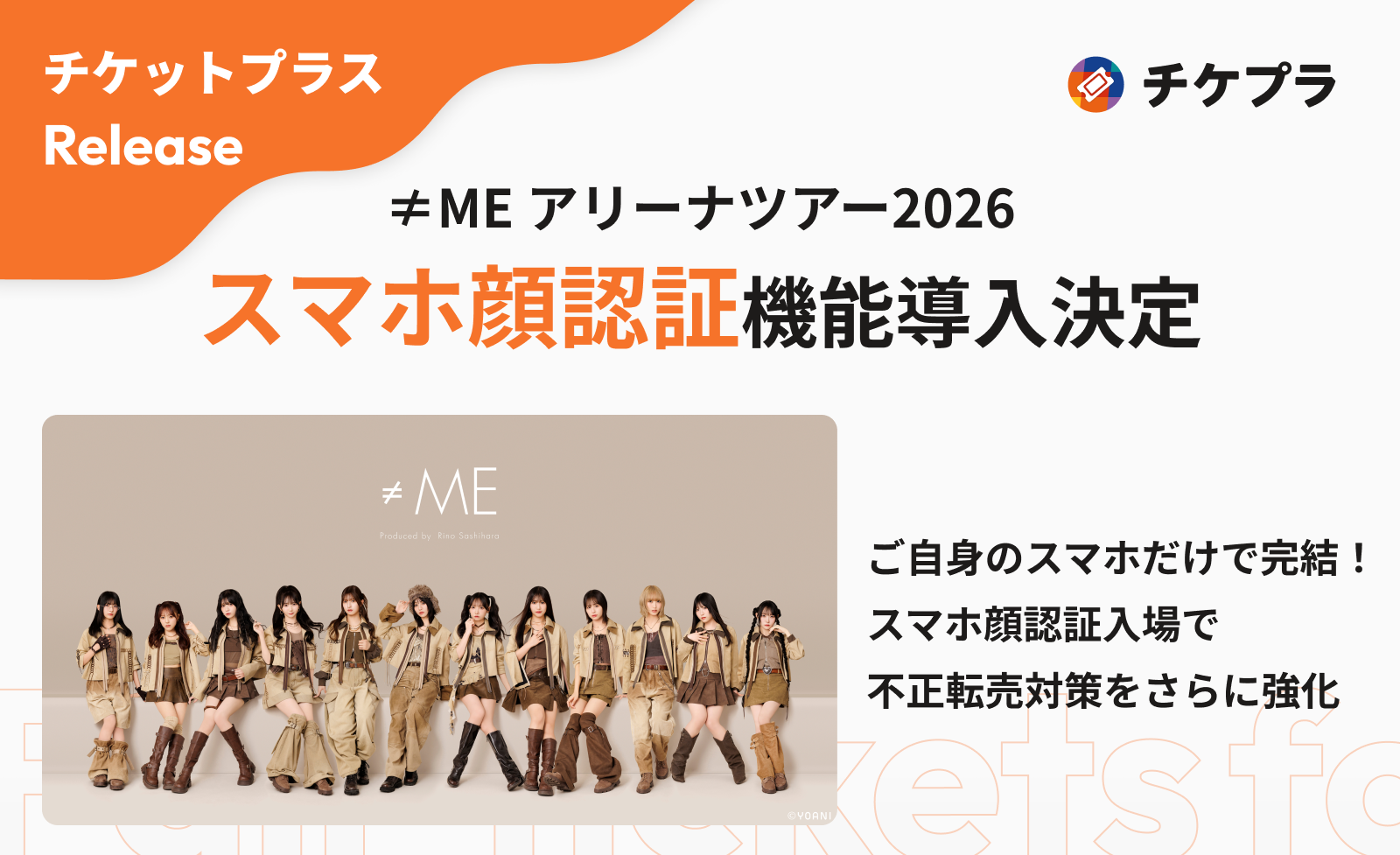 電子チケットサービス「チケプラ」や主催者公認の公式リセールサービス「チケプラTrade」を運営する株式会社チケットプラスの「スマートフォン完結型の顔認証入場機能」が、2026年5月4日(月・祝)からスタートする『≠ME アリーナツアー2026』に採用されたことをお知らせします。