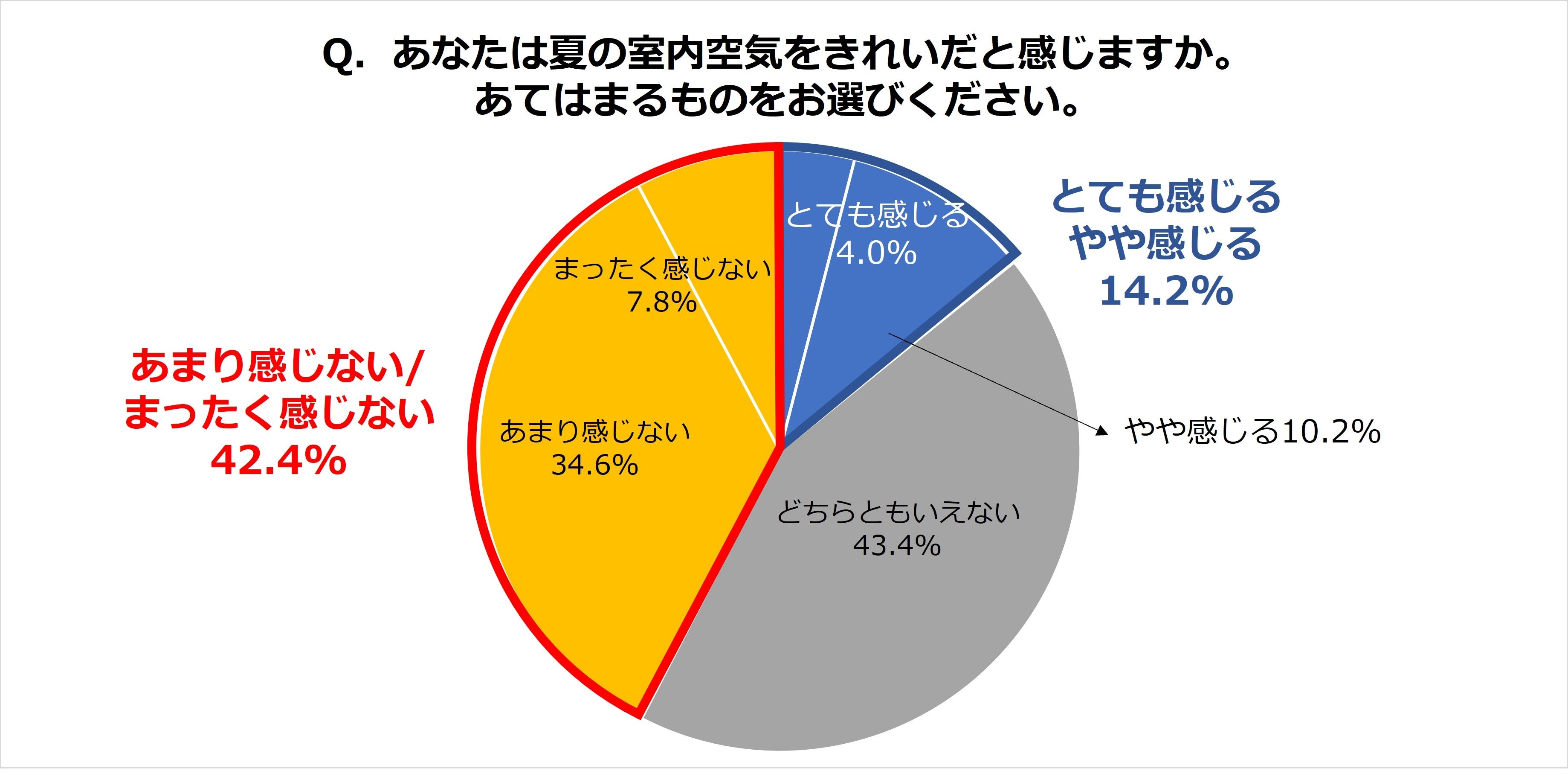 夏の室内空気を不快に感じる理由は、室温・湿気・風通しが上位を示しました。気持ちの良い空気を作るために必要な「空気の清潔さ」に対する意識は低く、最下位でした。