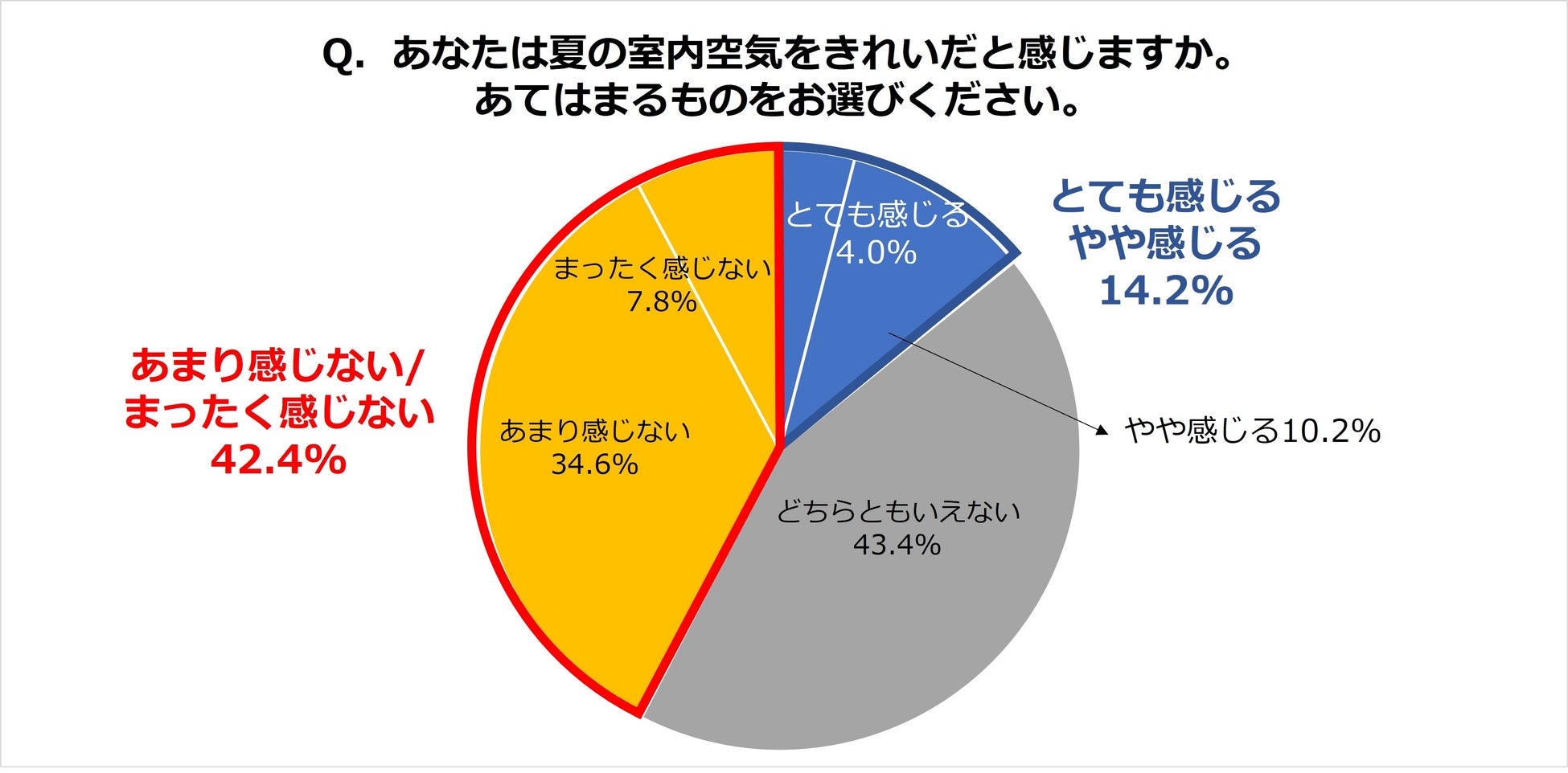 | ◆調査結果のポイント ・こどもを持つ親の63.0%が夏の室内空気を不快に感じる。 ・不快に感じる理由トップ3は「熱がこもるから(68.6%)」、「湿気がこもるから(63.8%)」、「風通しが悪いから(40.6%)」。しかし、空気の汚れについては15.2%と最下位。 ・夏の室内空気をきれいに感じる方はわずか14.2%と、空気中の汚れに対しての意識は高い。 |