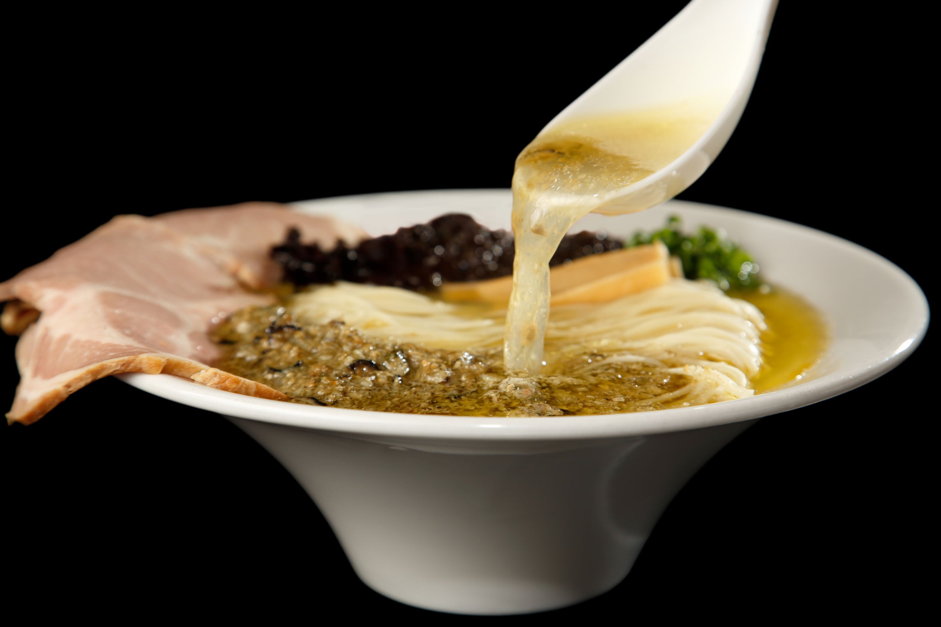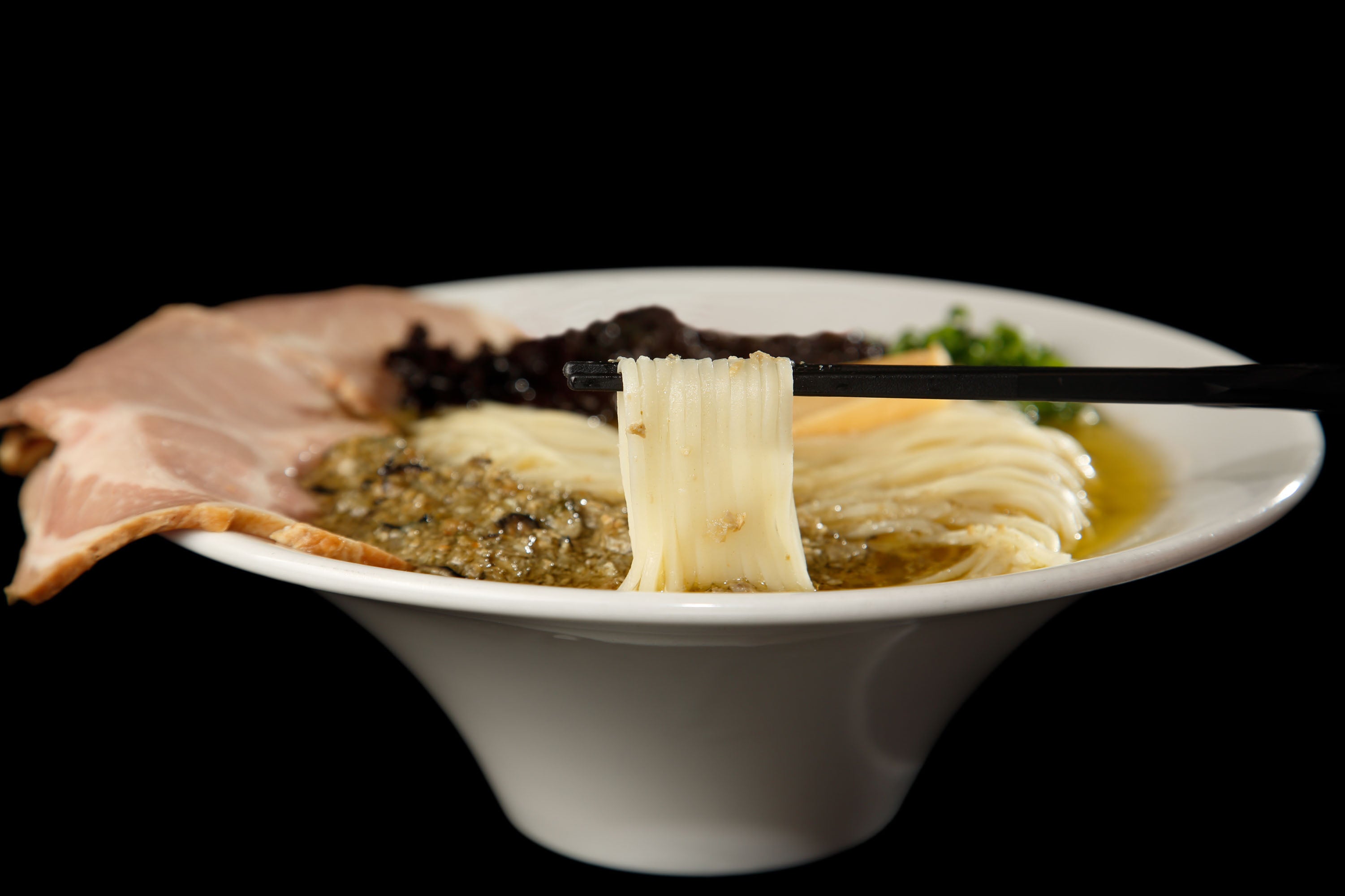広島県産の牡蠣のみを使用した贅沢なスープは、付属の牡蠣のアヒージョと合わせることで、香りはもちろんのこと強烈な牡蠣のうまみを感じられます。また、低加水の角切りストレート中細麺はパツンとした歯切れの良さと鋭いエッジが特徴で、牡蠣の旨味を損なうことなくスープとの一体感がもたらされています。牡蠣のペーストが絡みつきつつも後味はあっさりとしており、麺を口に運ぶ手が止まらない一杯です。
