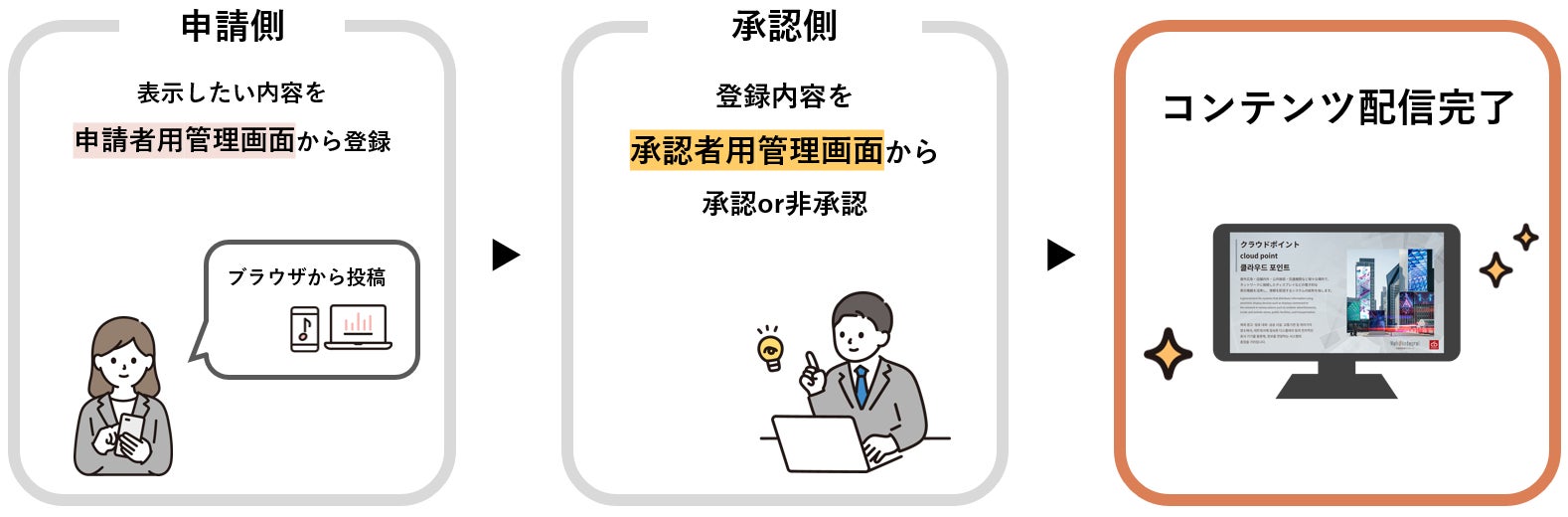 リアルタイムな販促活動をサポートする、ワークフロー式デジタルサイネージシステムです。テナント側がサイネージに表示したい画像やテキストを、SNS投稿のような手軽 な作業で申請することができます。施設管理者側はテナントから申請された情報をチェックし、サイネージへの表示を承認することができます。デジタルサイネージに情報を表示したいテナントなどの申請側、表示を許可する施設管理者などの承認側、それぞれに専用管理画面を用意し、スムーズなサイネージコンテンツの管理・更新を実現します。
