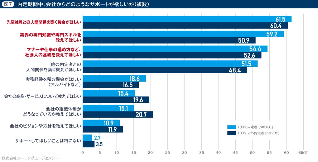 最後に、内定期間中、会社からどのようなサポートが欲しいか質問してみました。両者最も高い割合となったのは「先輩社員との人間関係を築く機会が欲しい」となり、6割以上の内定者が求めていました。100%内定者の2位には「業界の専門知識や専門スキルを教えてほしい」が入り、100%以外内定者よりも8.3ポイント高い結果でした。一方、100%以外内定者では「マナーや仕事の進め方など、社会人としての基礎を教えてほしい」が2位となりました。100%以外内定者が抱える不安の2位である「社会人としての考え方に慣れることができるか」といった気持ちの裏返しと思われます。(図7)