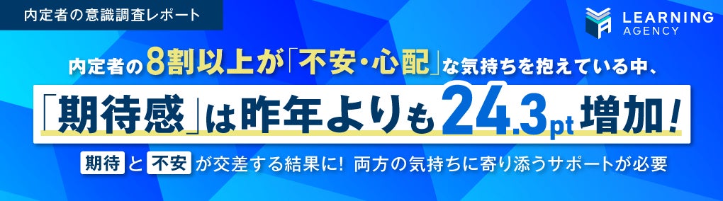 内定者の8割以上が「不安・心配」な気持ちを抱えているなか、「期待感」は昨年よりも24.3pt増加!【期待】と【不安】が交差する結果に!両方の気持ちに寄り添うサポートが必要