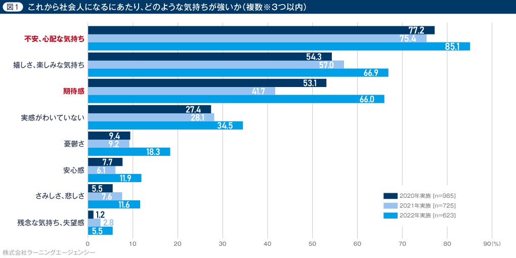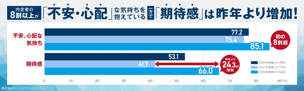1. 「不安・心配な気持ち」を抱えている内定者が初の8割超。一方で「期待感」は昨年よりも2割以上増加
